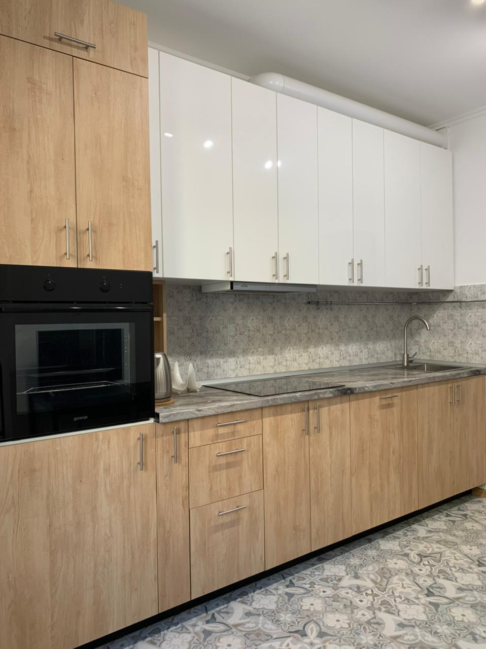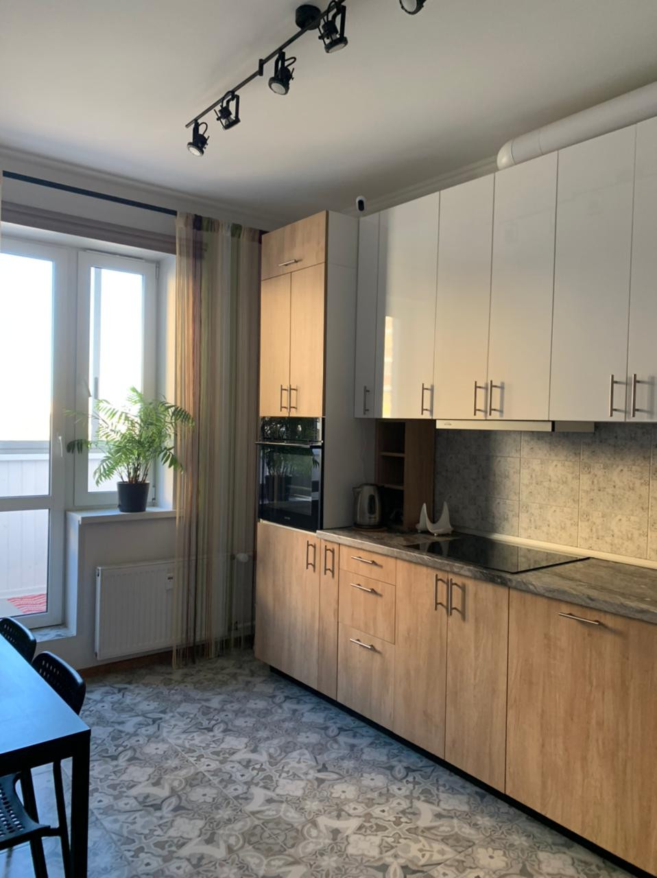 В кухне заменён кафель на полу, «фартук настенный» выполнен также из кафеля. Установлена новая кухонная мебель и встроенная техника ( остается покупателю).