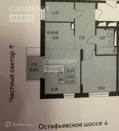 Общая площадь 44.4 м2