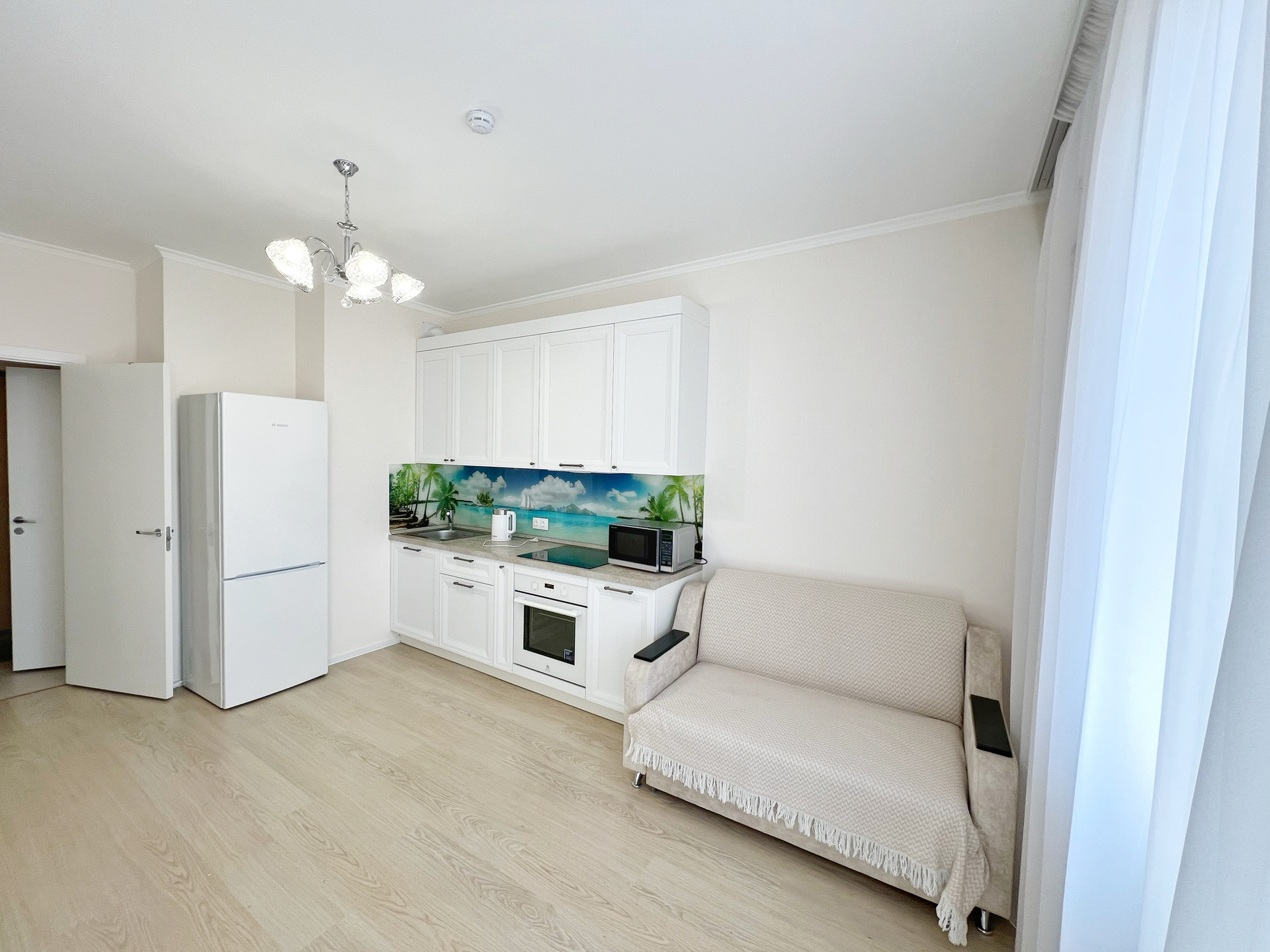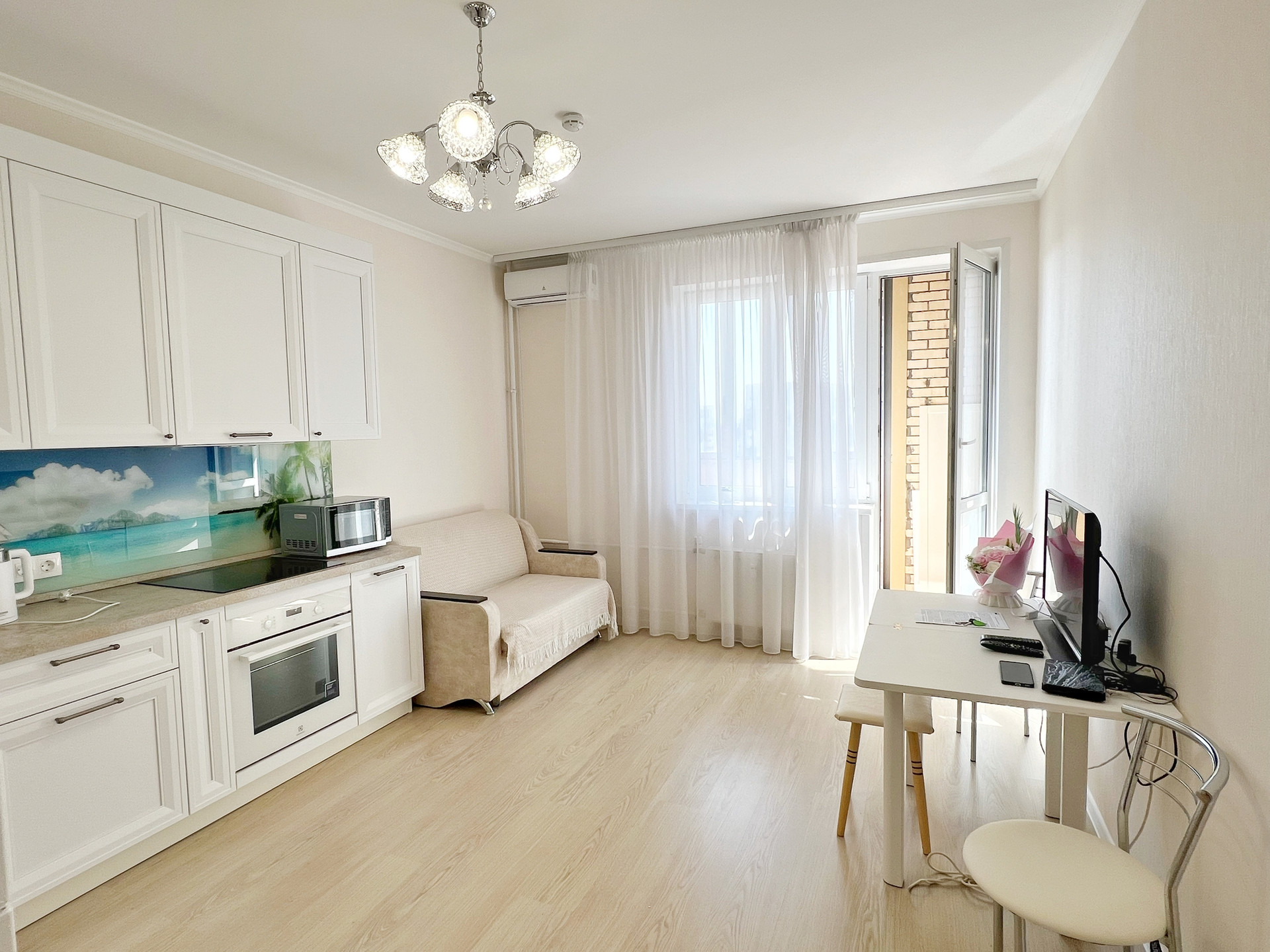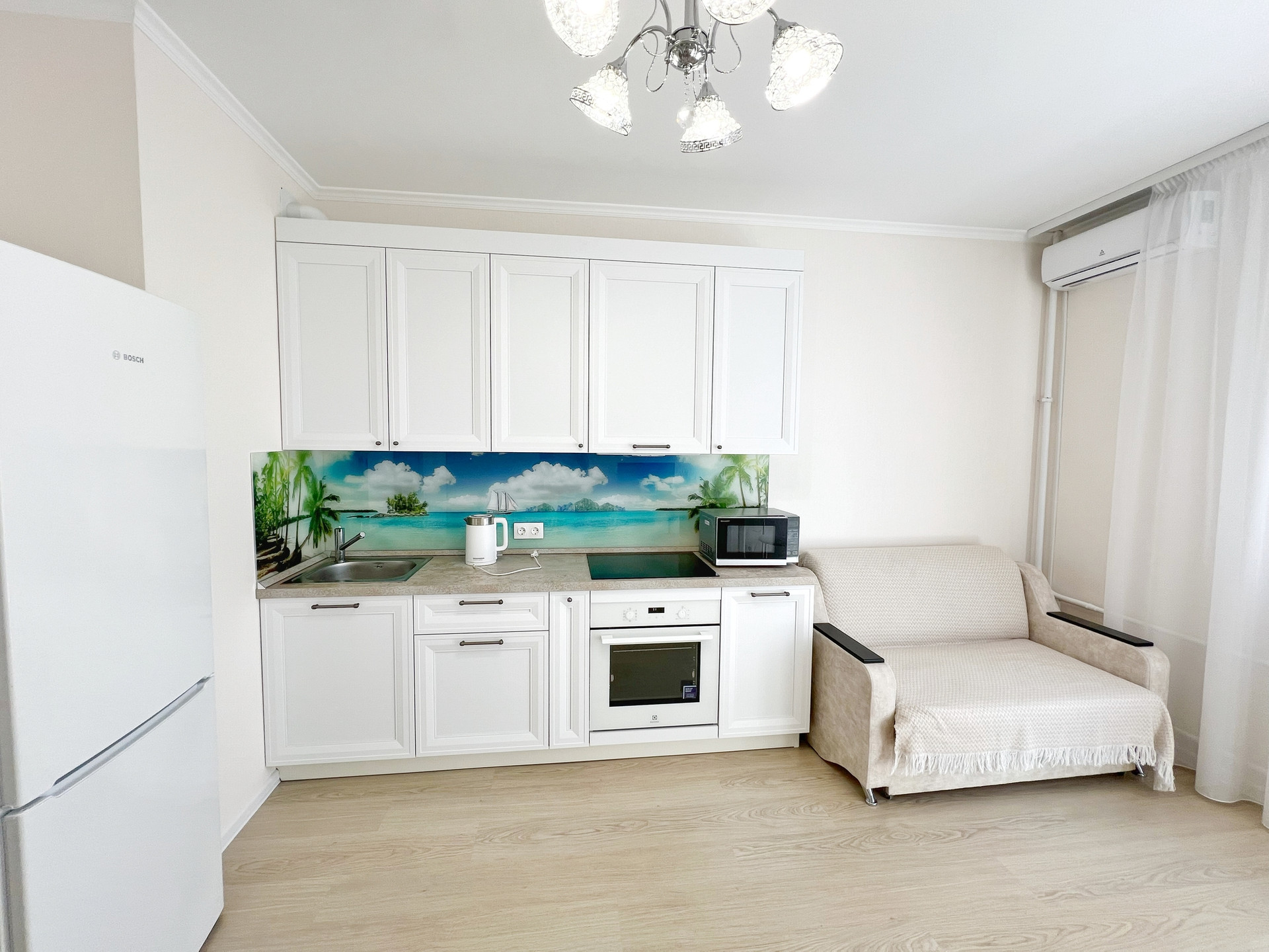 Установлен качественный кухонный гарнитур с встроенной техникой Electrolux (не пользовались, все новое), кондиционер.