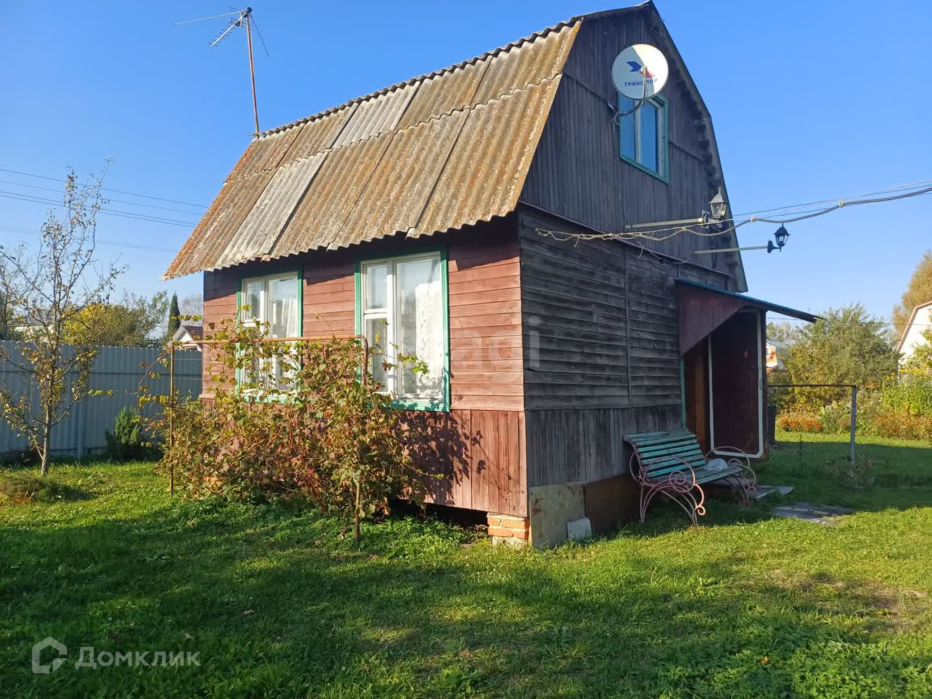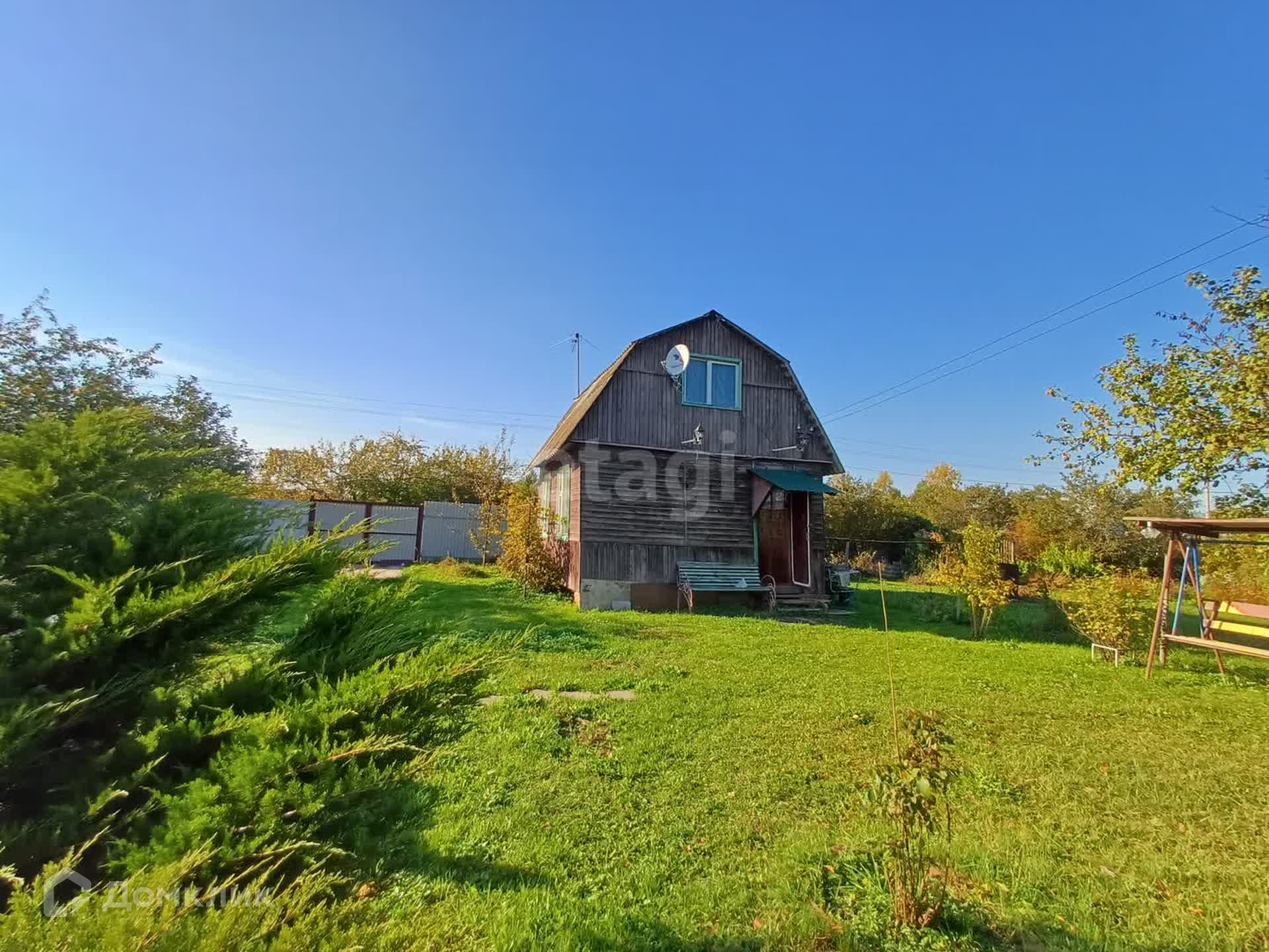 Рядом с дачей есть место для стоянки автомобиля или садовой техники, а также небольшая зона отдыха с качелями.
