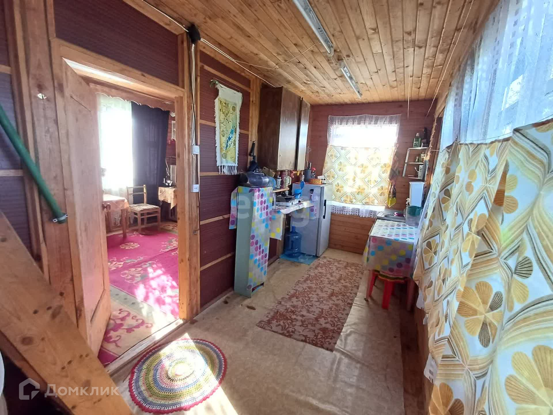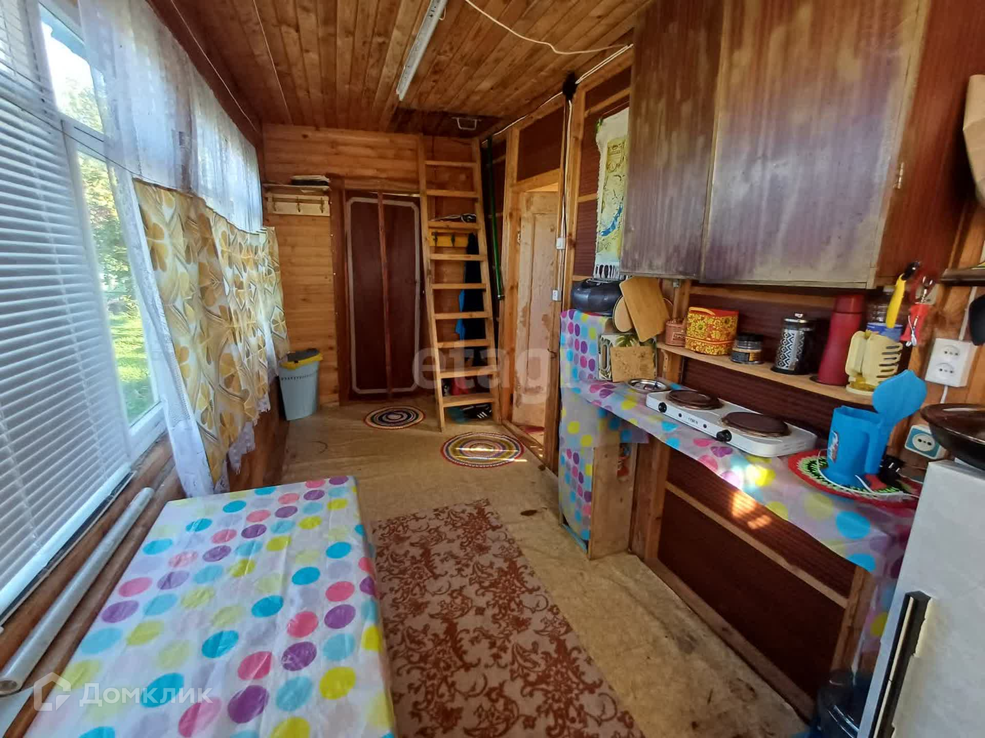 Дом дачи двухэтажный и компактный, его площадь составляет около 25 квадратных метров. Внутреннее пространство включает в себя кухню и гостиную. Интерьер выполнен в простом и уютном стиле с использованием натуральных материалов.