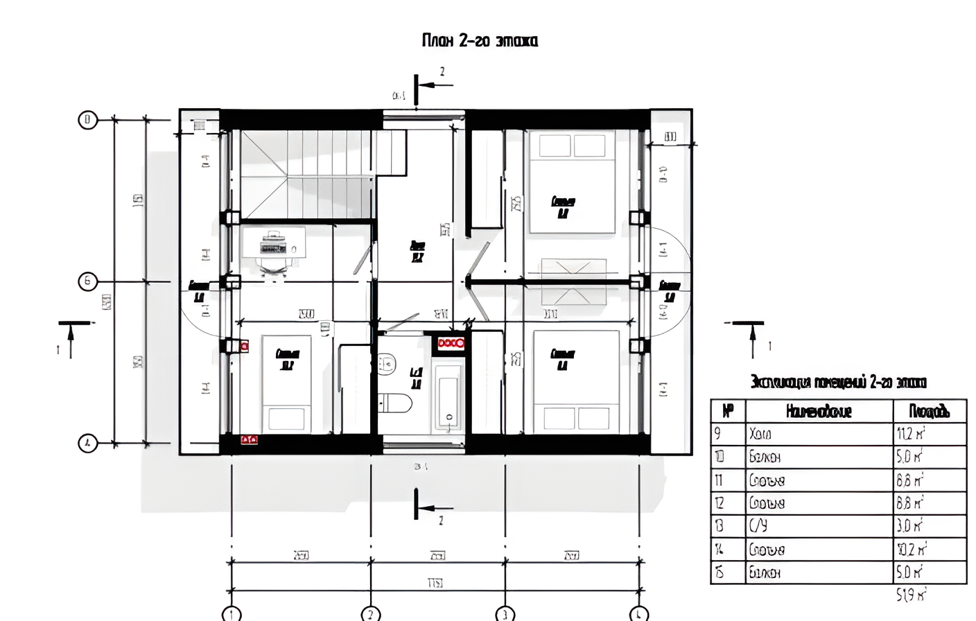- 2- й этаж: 3 спальни и санузел