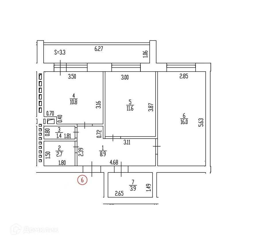 Общая площадь 54.9 м2