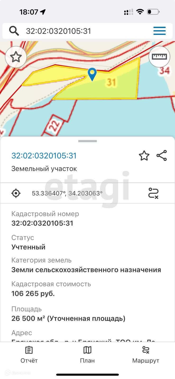 Продается земельный участок сельхозназначения 2,65 Га в собственности в черте г. Брянска. Расположен на берегу обводненного карьера Орлик-5. Подходит под постройку базы отдыха или рыбного хозяйства.
