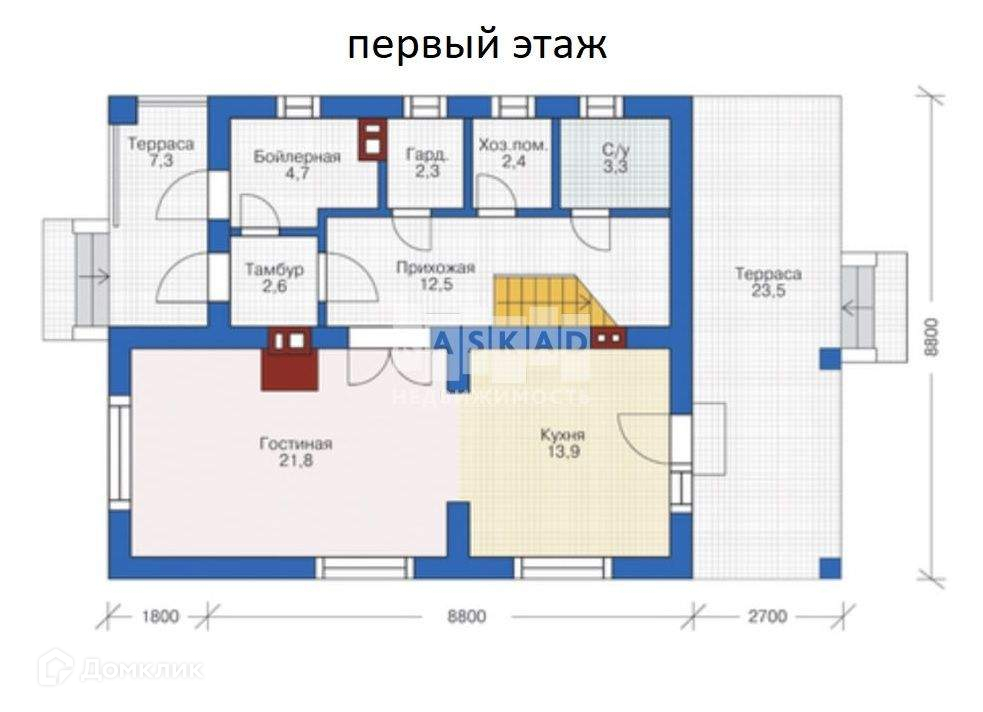 На первом этаже малая терраса с козырьком и центральным входом, прихожая, котельная, большая гардеробная комната, с/у и большая кухня - гостиная с выходом на вторую террасу.