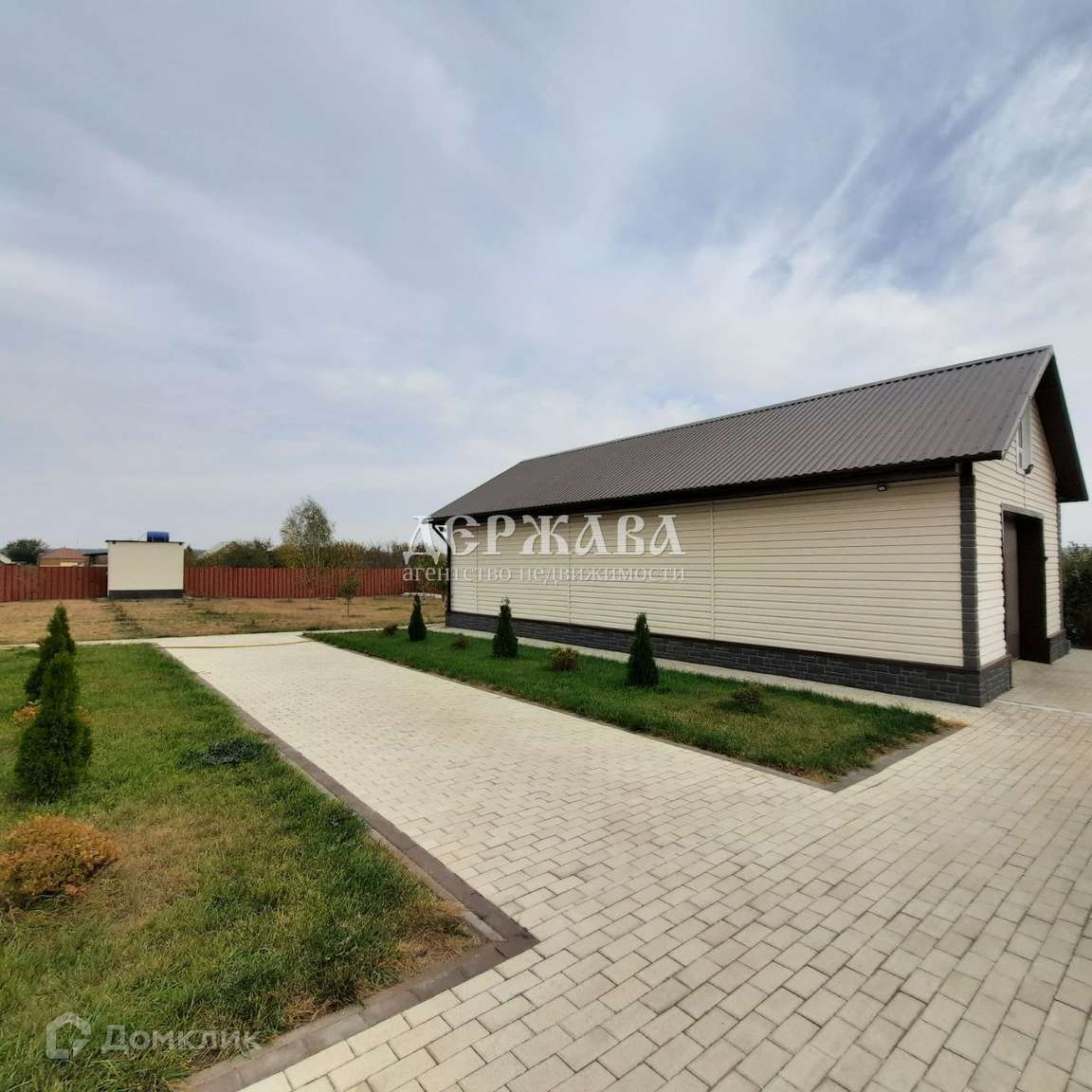 Для хранения автомобиля и другой техники имеется гараж с мастерской. Двор перед домом вымощен тротуарной плиткой.