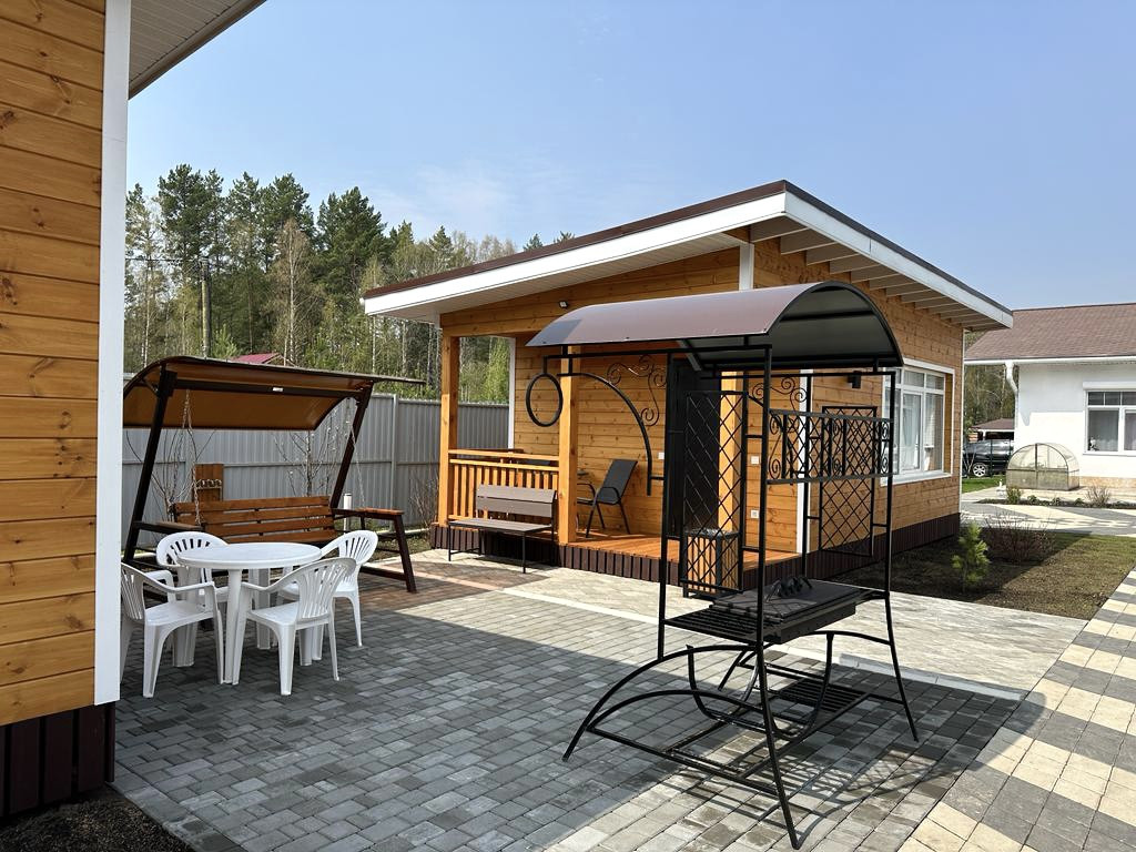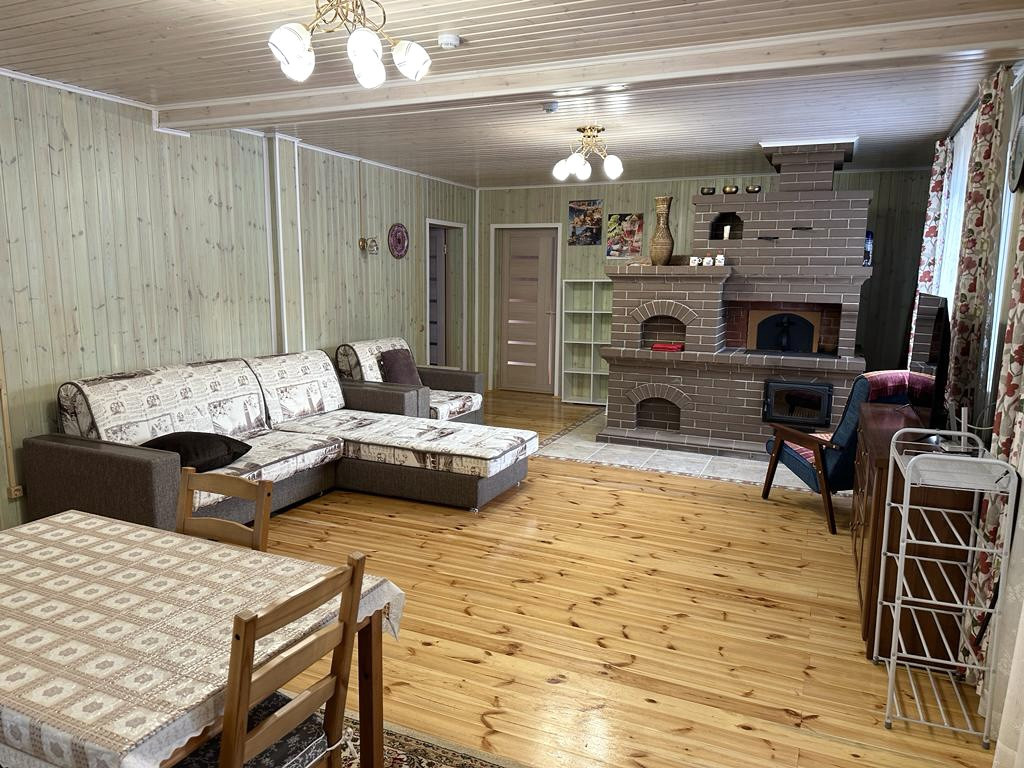 Дом из бруса: панорамная веранда с зоной отдыха; кухня, гостиная зона с русской печью; 2 спальни с 2спальными кроватями, шкафами, комодами; ванная комната, русская баня.