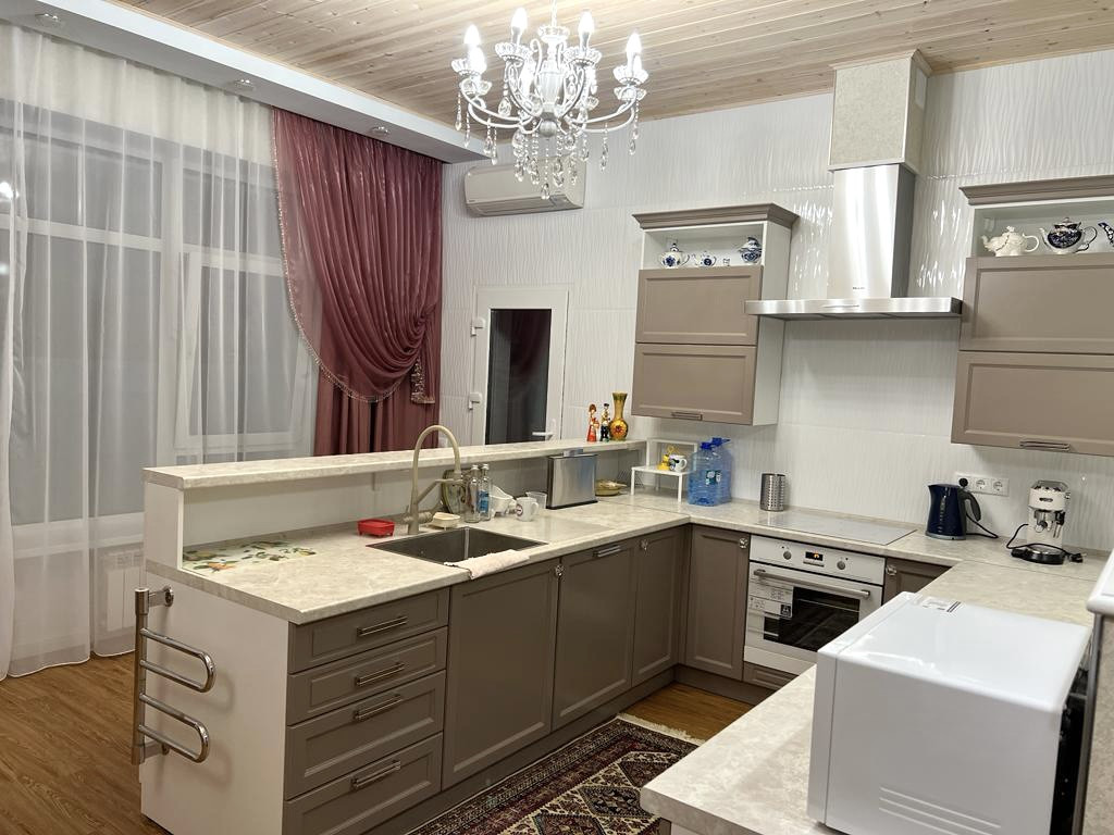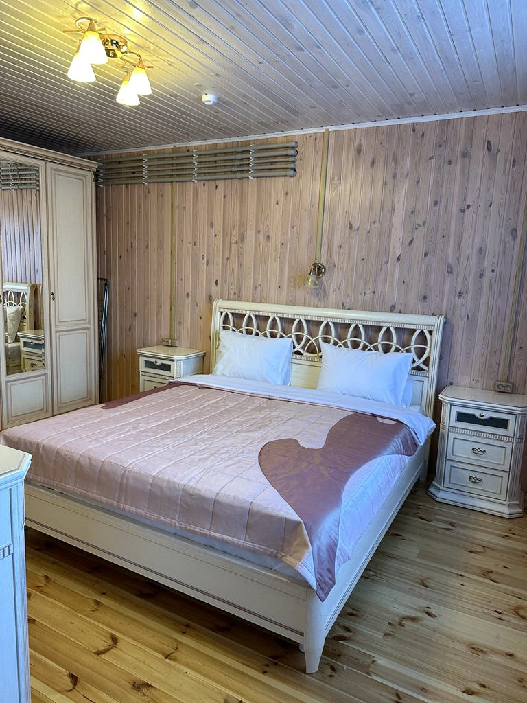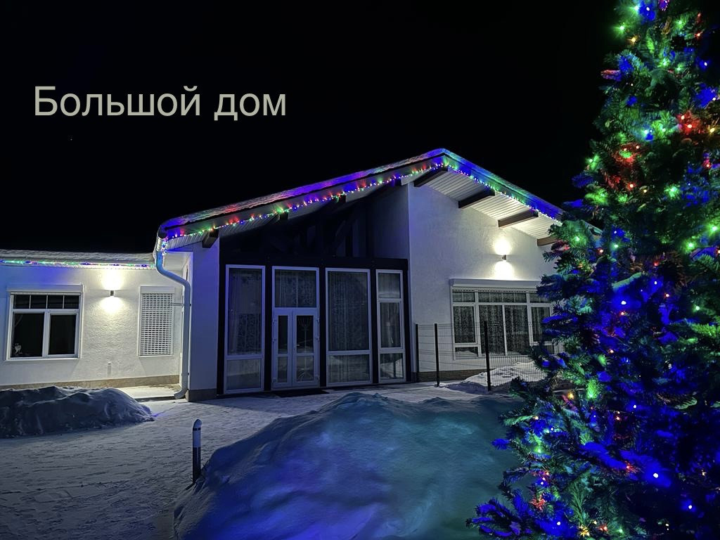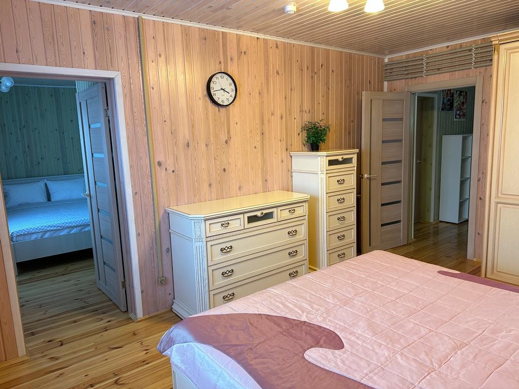 Большой дом (3 спальни, во всем доме теплые водяные теплые полы и деревянные, экологичные потолки): веранда с электрическим теплым полом, с кухней и обеденной зоной; прихожая с гардеробной; гостиная зона, обеденная зона, кухня. Установлен кондиционер и вся необходимая бытовая техника. Из кухни выход в холодную комнату для хранении продуктов, кухонной техники и тд. Кладовая. Просторная ванная комната. 2 Спальни с большими 2спальными кроватями (180*200), шкафы, комоды. Третья спальня гостевая (детская). К дому примыкает котельная с отдельным входом. Из Дома выход в гараж, и санузел с постирочной.