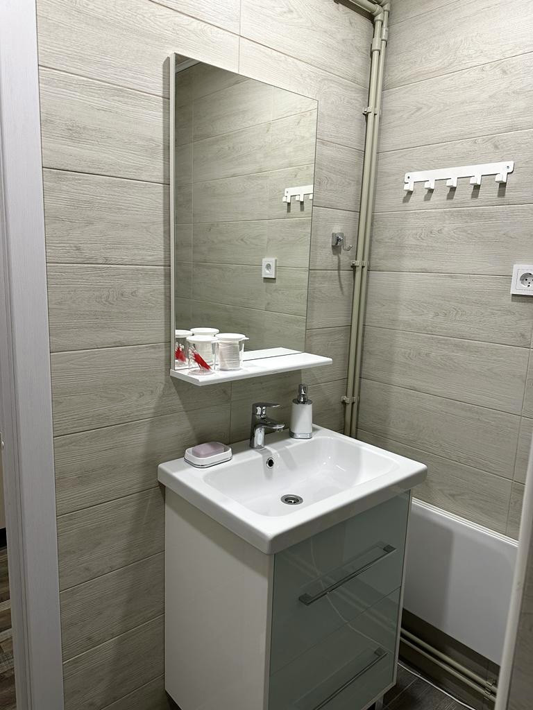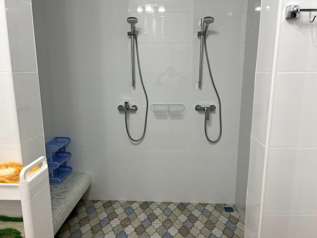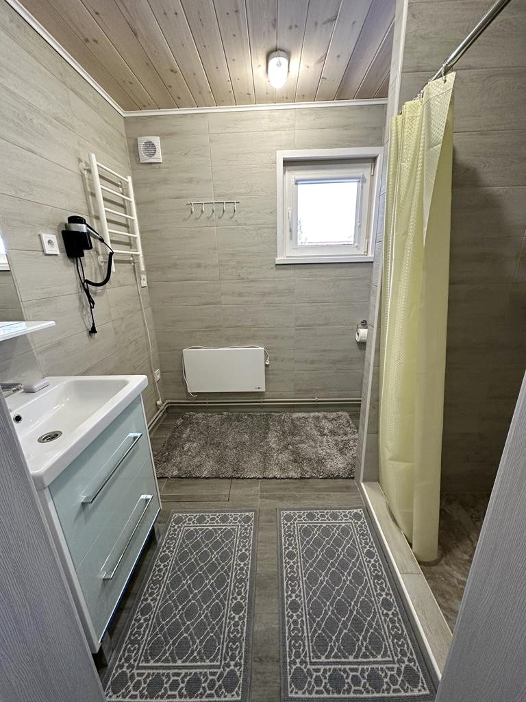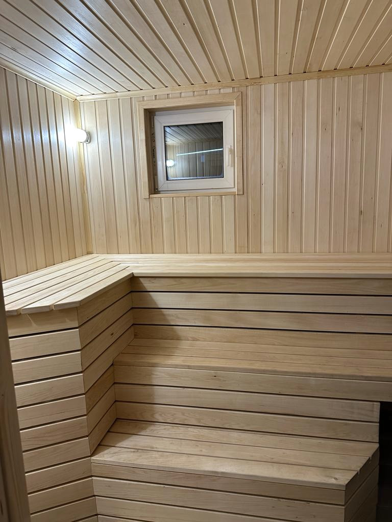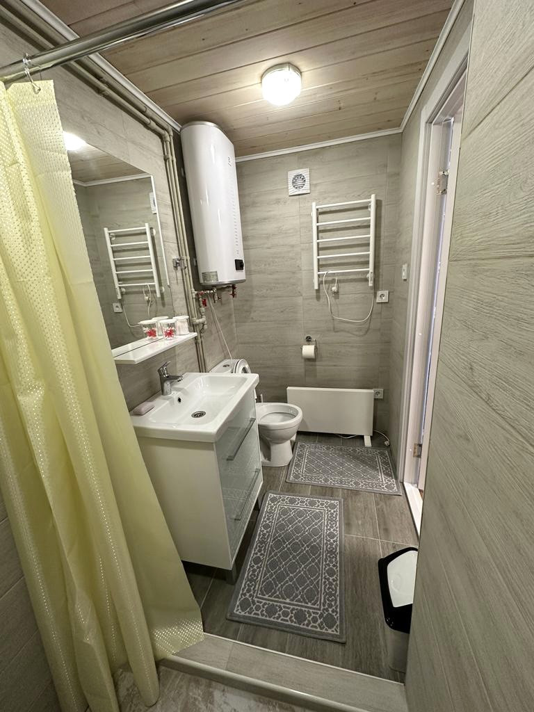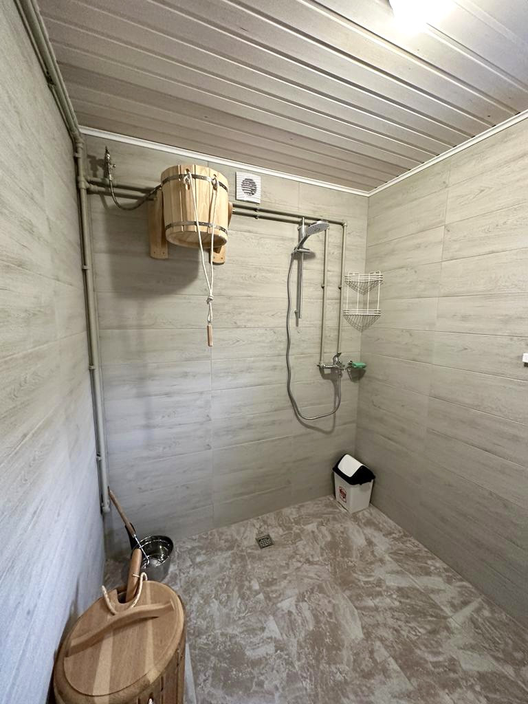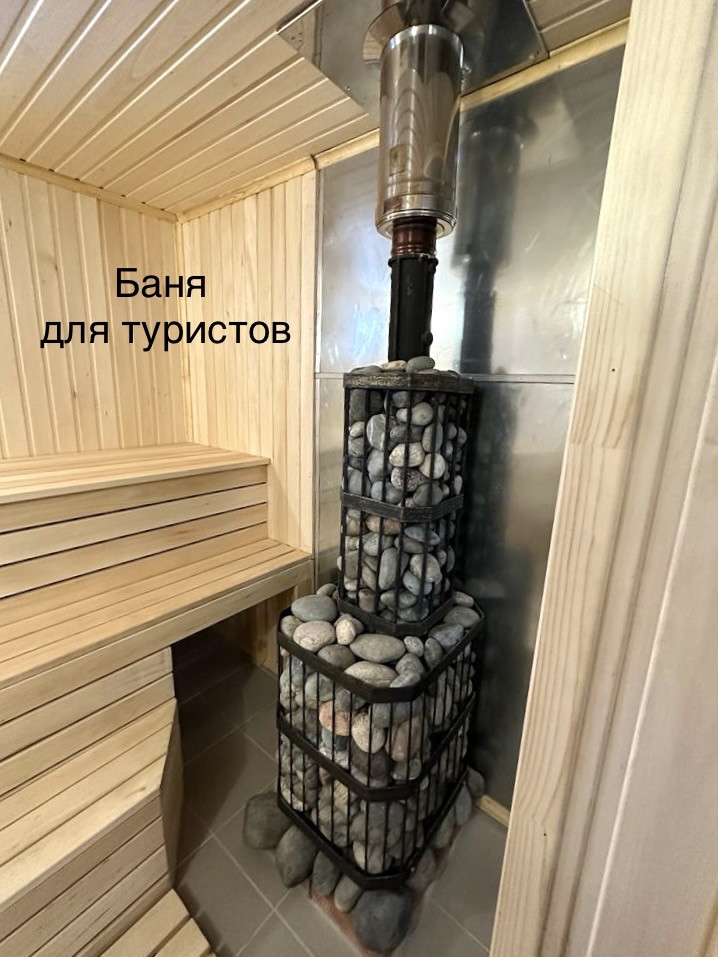 Отдельностоящая баня для туристов: парная, санузел с душем, комната отдыха с небольшой кухней.