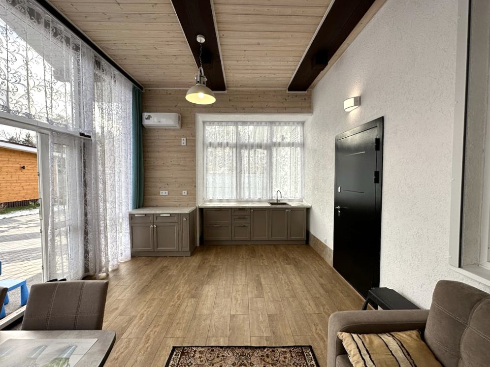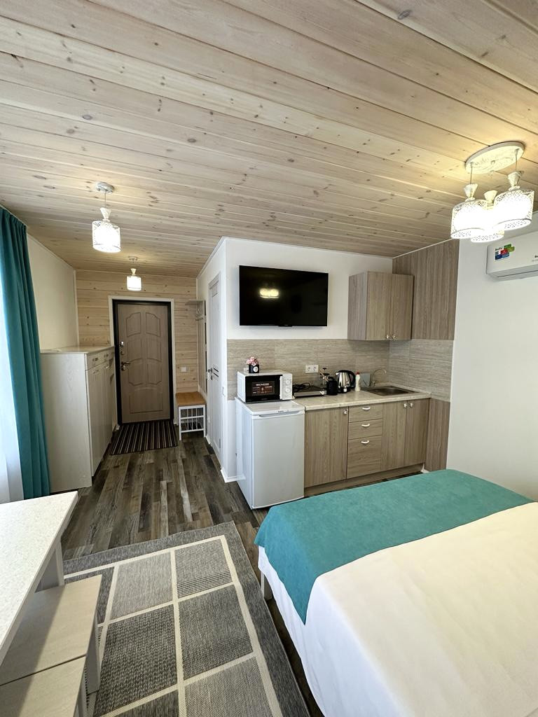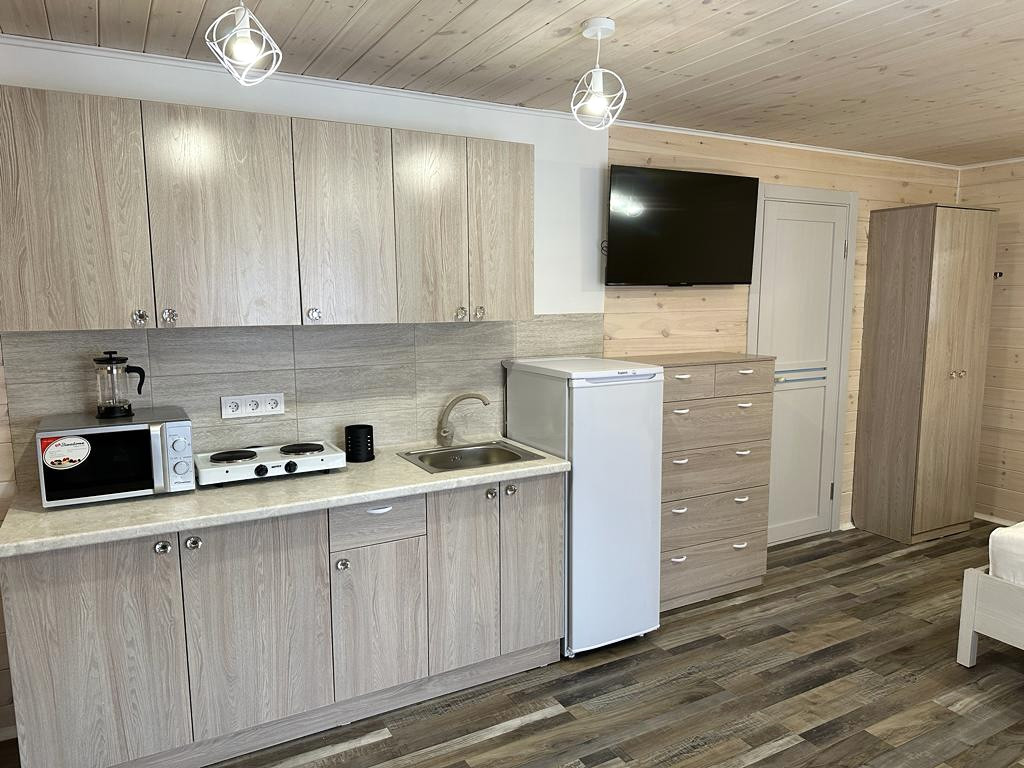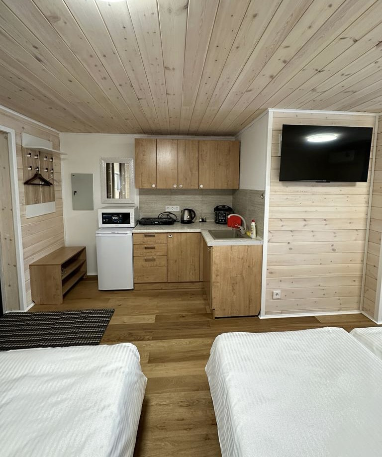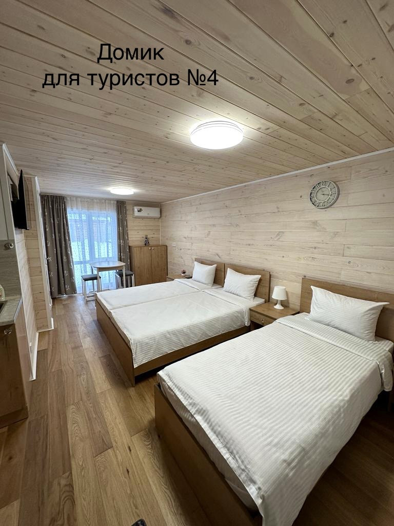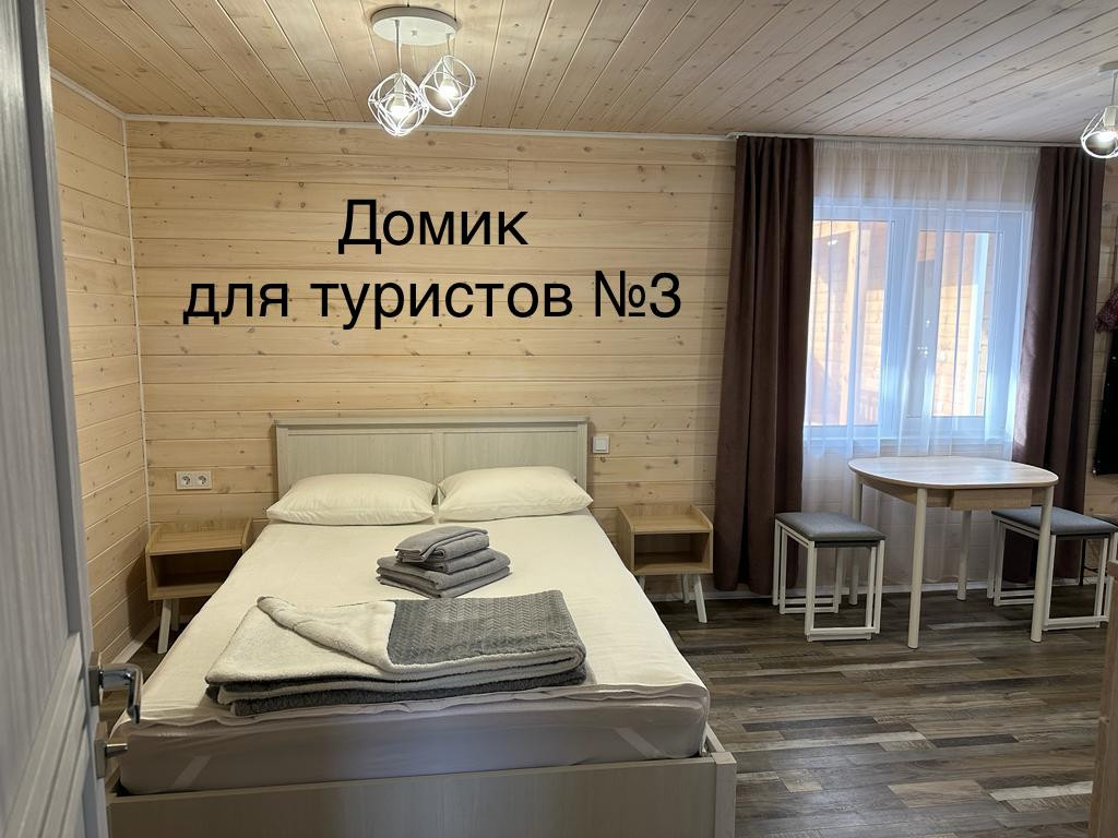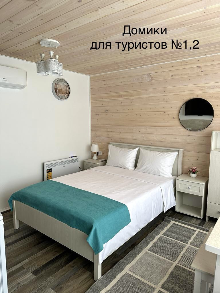 Домики для туристов: В каждом кухонный гарнитур с необходимой бытовой техникой, спальное место, стол со стульями, кондиционер, ванная комната с бойлером.