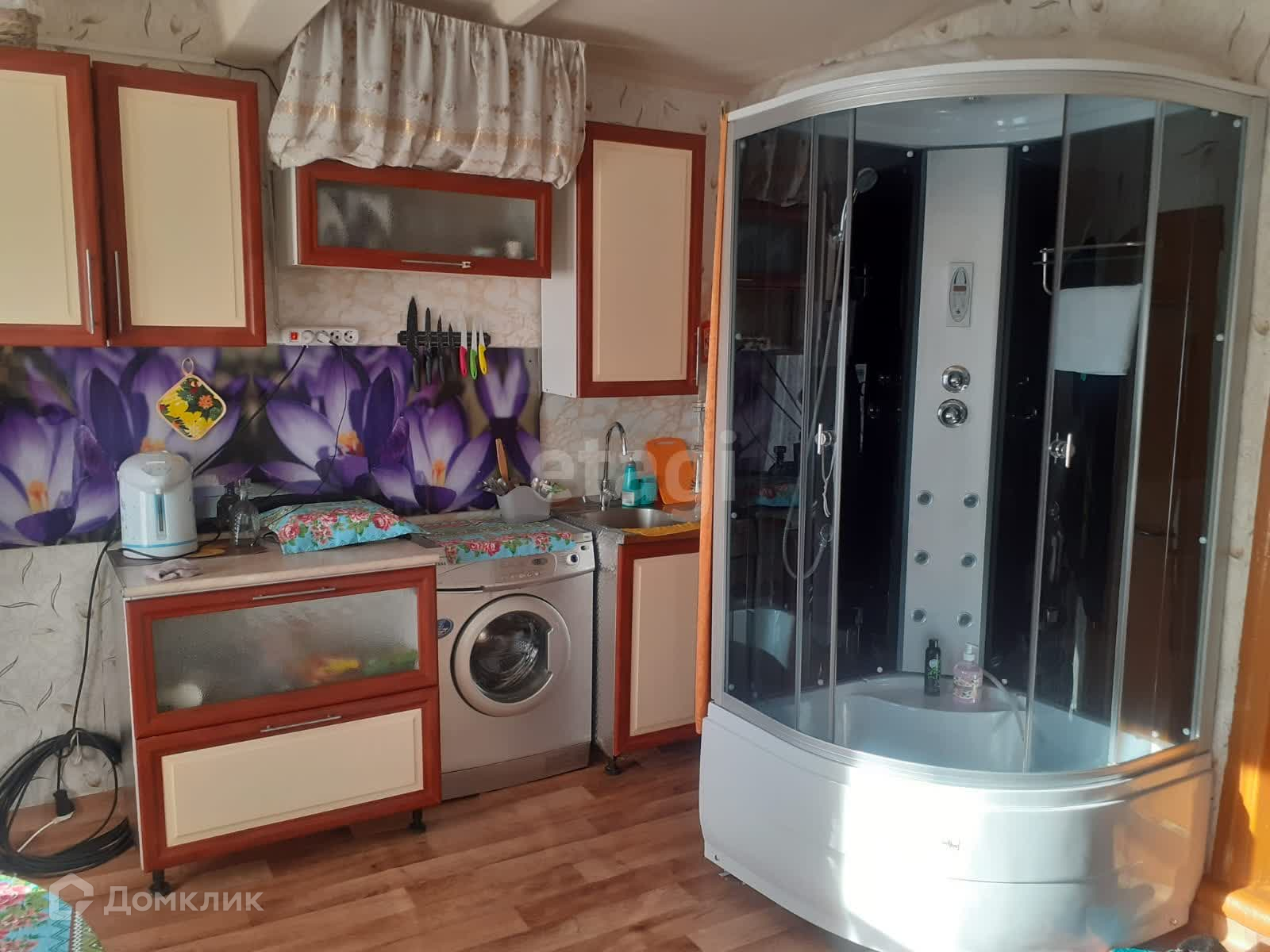 В доме проведена вода из скважины, установлен водонагреватель и душевая кабина.