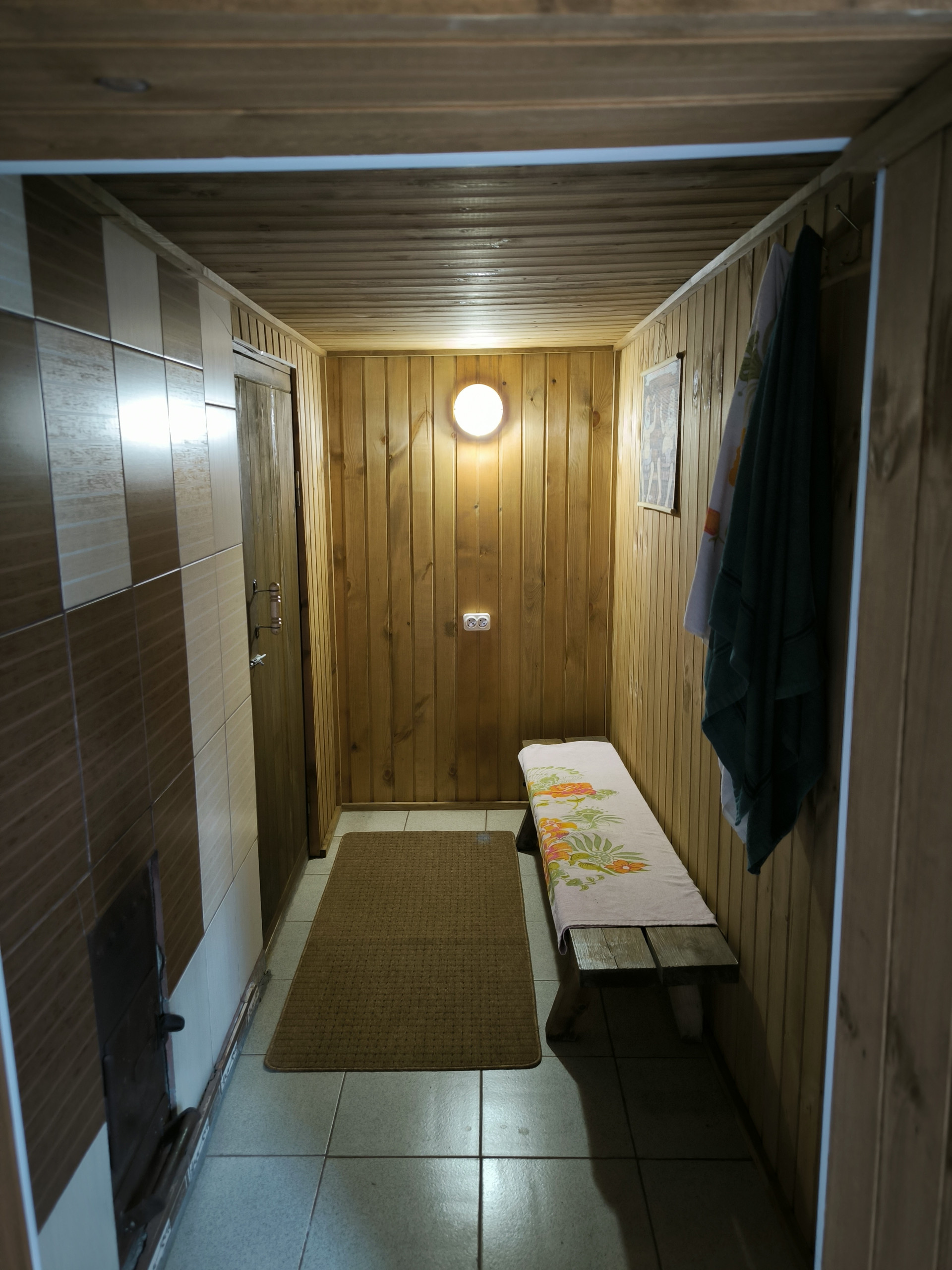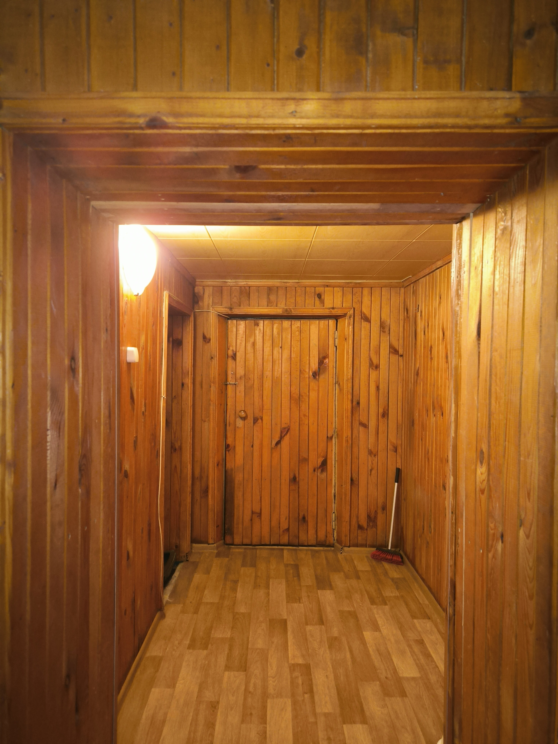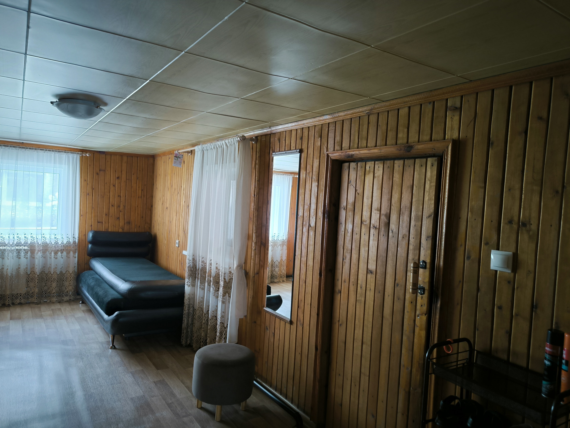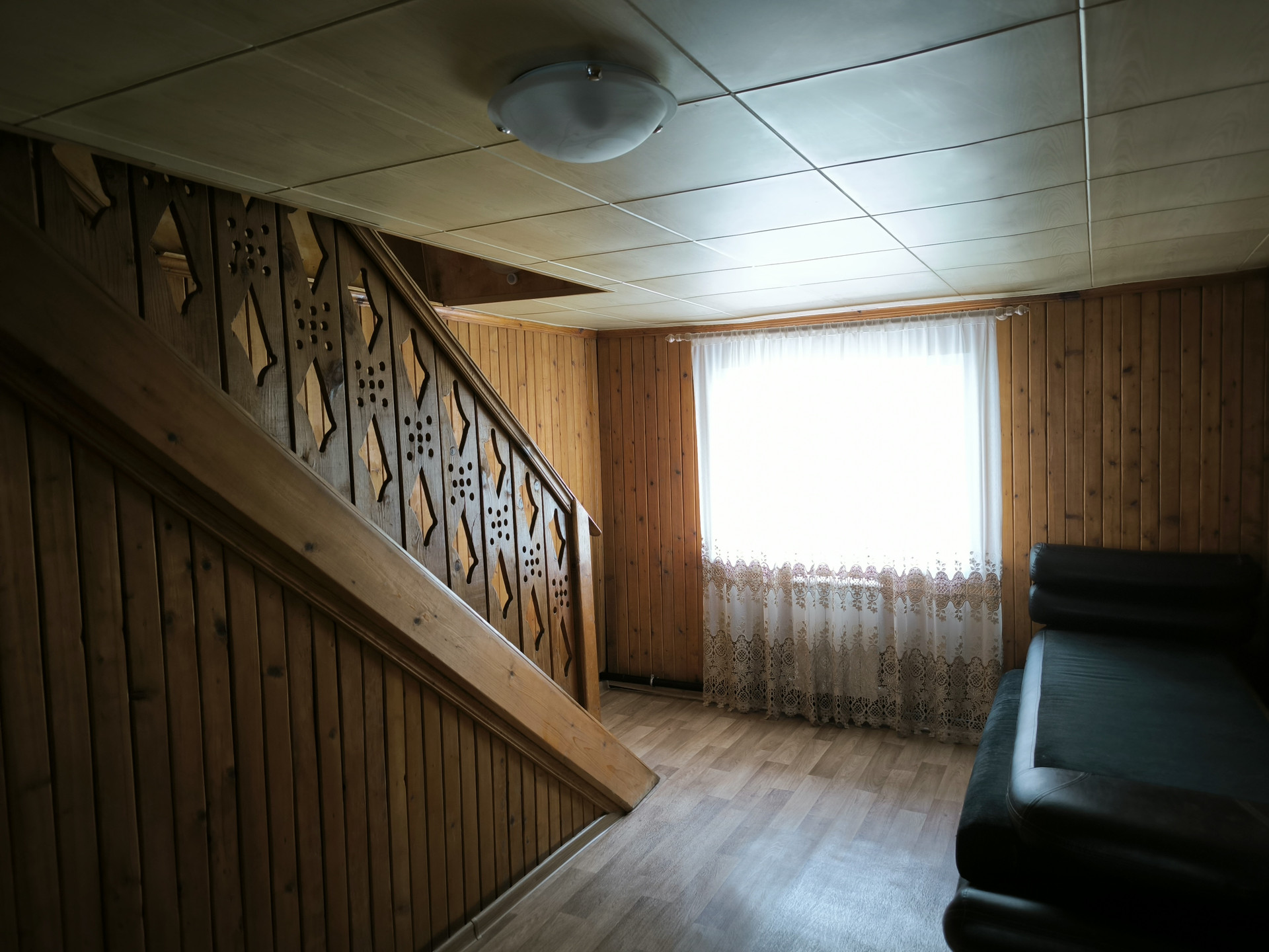 Весь первый этаж, кроме ванной, обделан деревянной вагонкой, что создаёт дополнительную уютную атмосферу в доме.