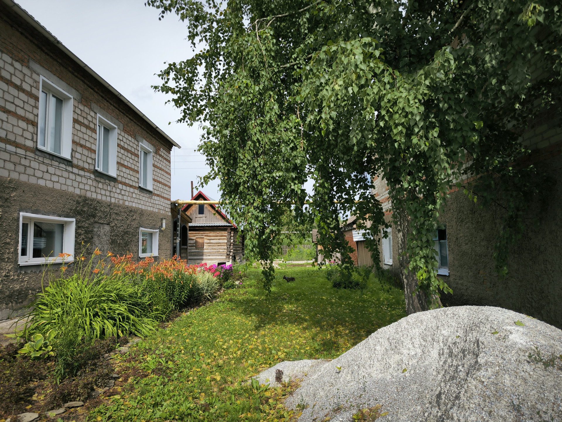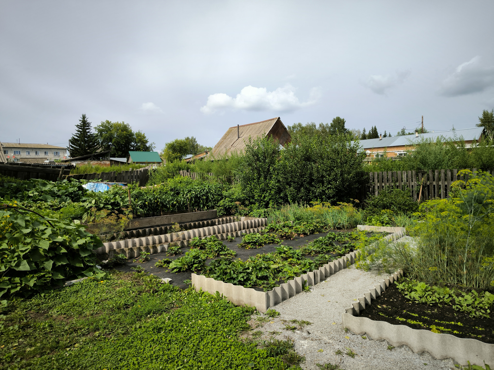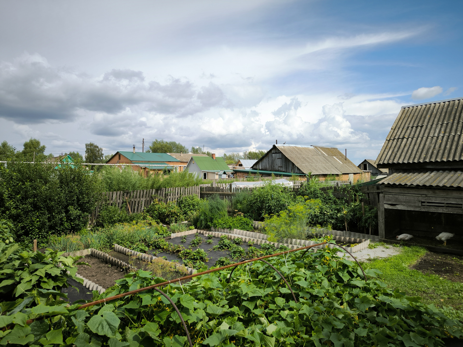 Плодородный огород, много ягоды - смородина, малина, клубника, крыжовник, также высажены красивые цветы вдоль дома.