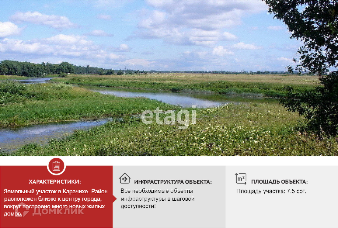 Тогда это предложение для вас !!! Земельный участок 7,5 соток в КАРАЧИХЕ Район расположен близко к центру города,вокруг построено много новых жилых домов. ЗЕМЛЯ ИЖС,под строительство коттеджа ЭЛЕКТРИЧЕСТВО - столб рядом с участком ГАЗ- ТУ КАНАЛИЗАЦИЯ- центральная,на фото есть люк Рядом река Пахма Инфраструктура города : продуктовые магазины,пекарня,кафе,остановка городского транспорта в пешей доступности. Звоните ,показ в любое время Номер в базе: 8994399. Район: Пахна с..