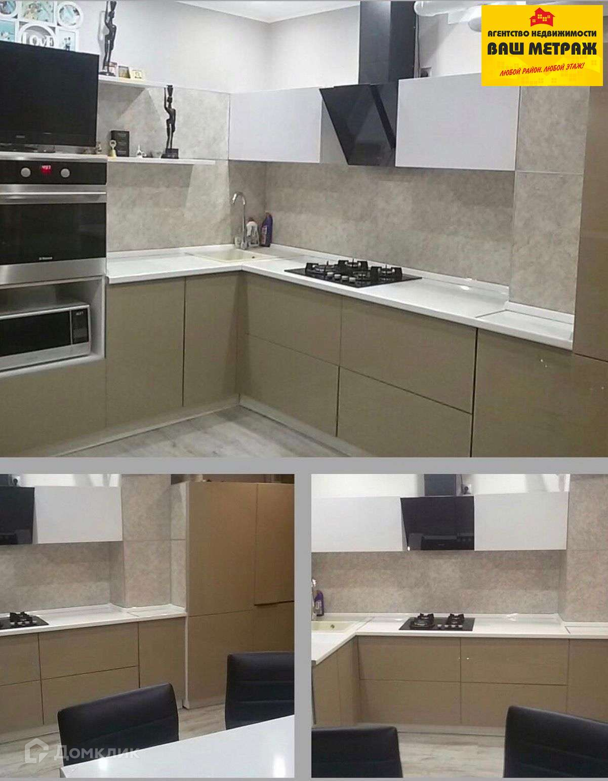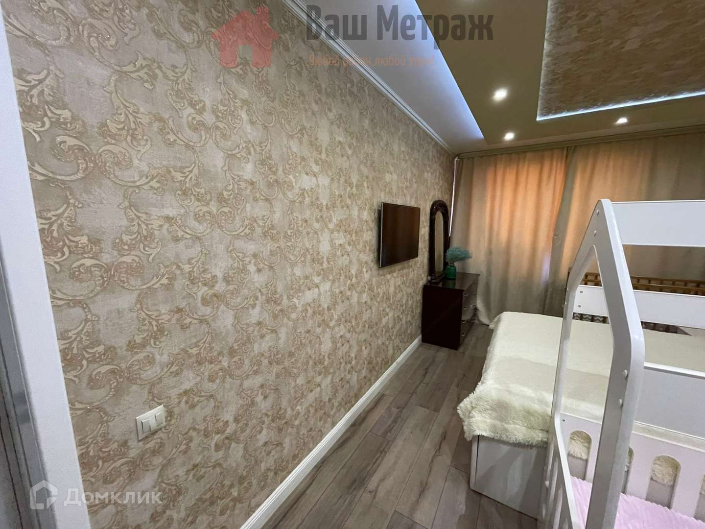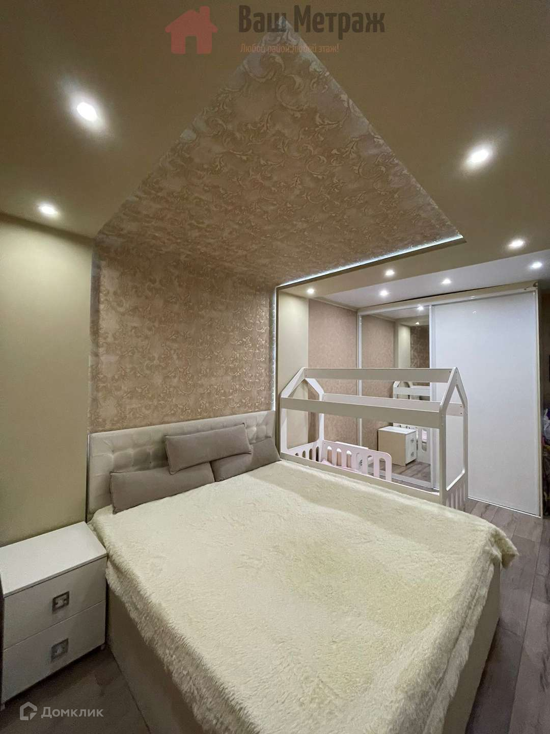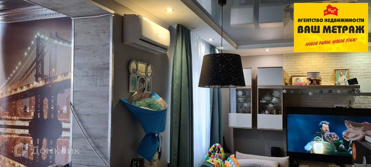 С новой мебелью: кухонный гарнитур с барной стойкой, шкафы и стенка в зале, кровать, 2 тумбы и встроенный шкаф-купе в спальне, кондиционер. Кухня и зал объединены, спальня изолирована. Детская мебель забирается.