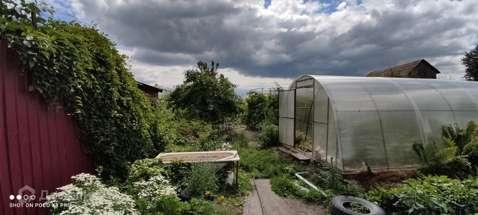 На участке расположены: хоз постройки, два гаража, добротная баня на дровах, 2 теплицы под огурцы и помидоры, а также построена коптильня из кирпича, чтобы коптить всё, что пожелаете.