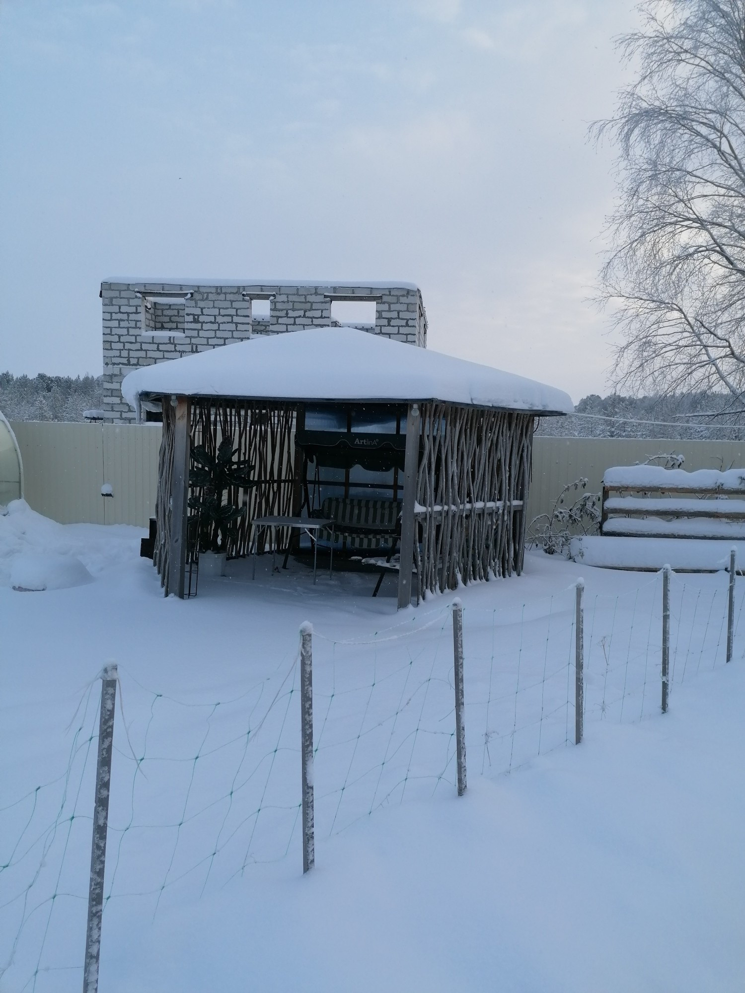 На территории построено: баня с газовым отоплением, беседка, гараж  теплый ещё под два автомобиля (или любой другой транспортной техники), вольер для собаки, два погреба, три теплицы (две под насаждения, одна была сделана для бассейна в теплицах все выложено плиткой).