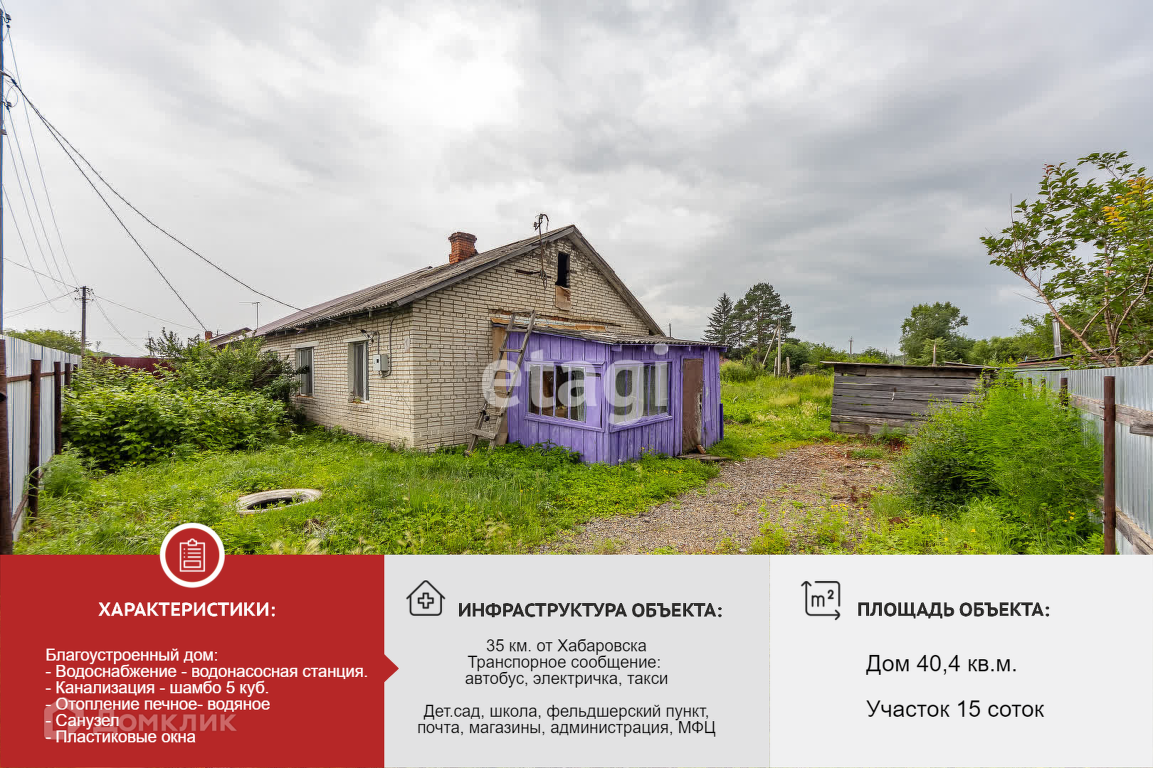 Продается благоустроенный дом с участком в с. Партизанское, ЕАО, в тихом спокойном районе, 35 км от Хабаровска. Дом кирпичный, общей площадью 40.4, 2 комнаты, большая кухня площадью более 14 кв.м. Окна пластиковые, на полу линолеум, отопление - печное-водяное, водоснабжение - скважина в доме с насосной станцией; санузел совмещен в кафеле, канализация шамбо 5 куб. Участок 15 соток, огорожен профлистом.