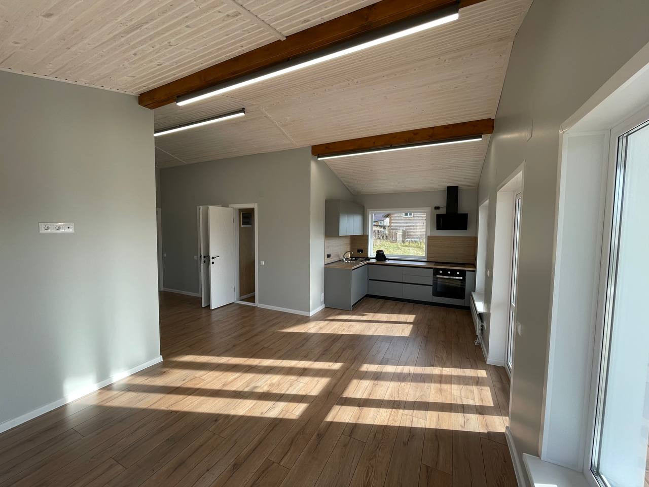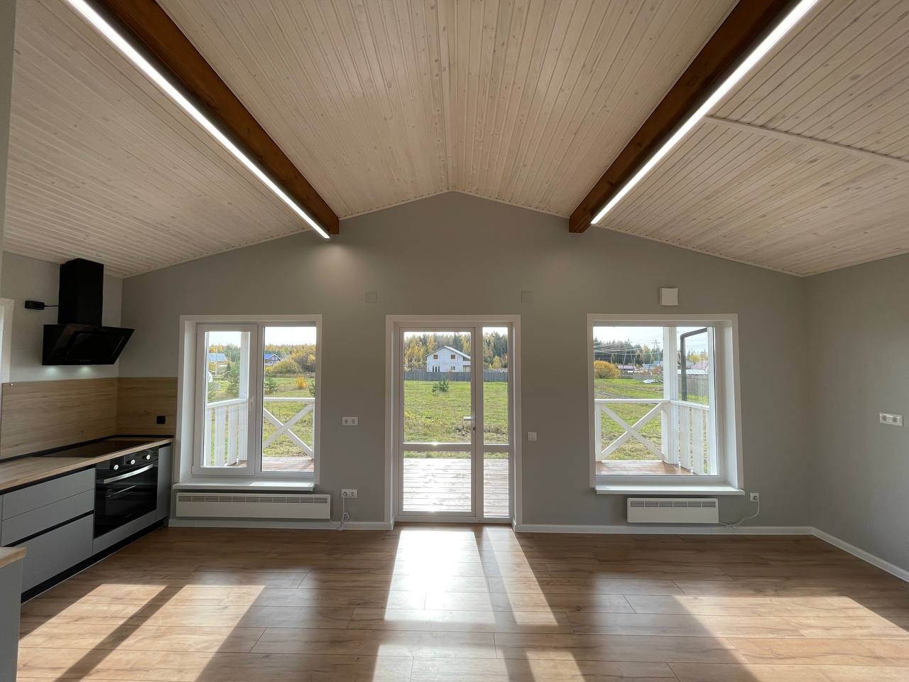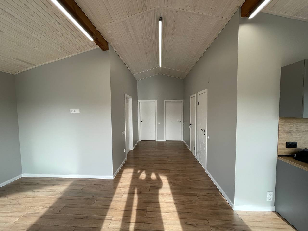 Открытая кровля по всему дому. Высота потолков 3,9 метра в коньке