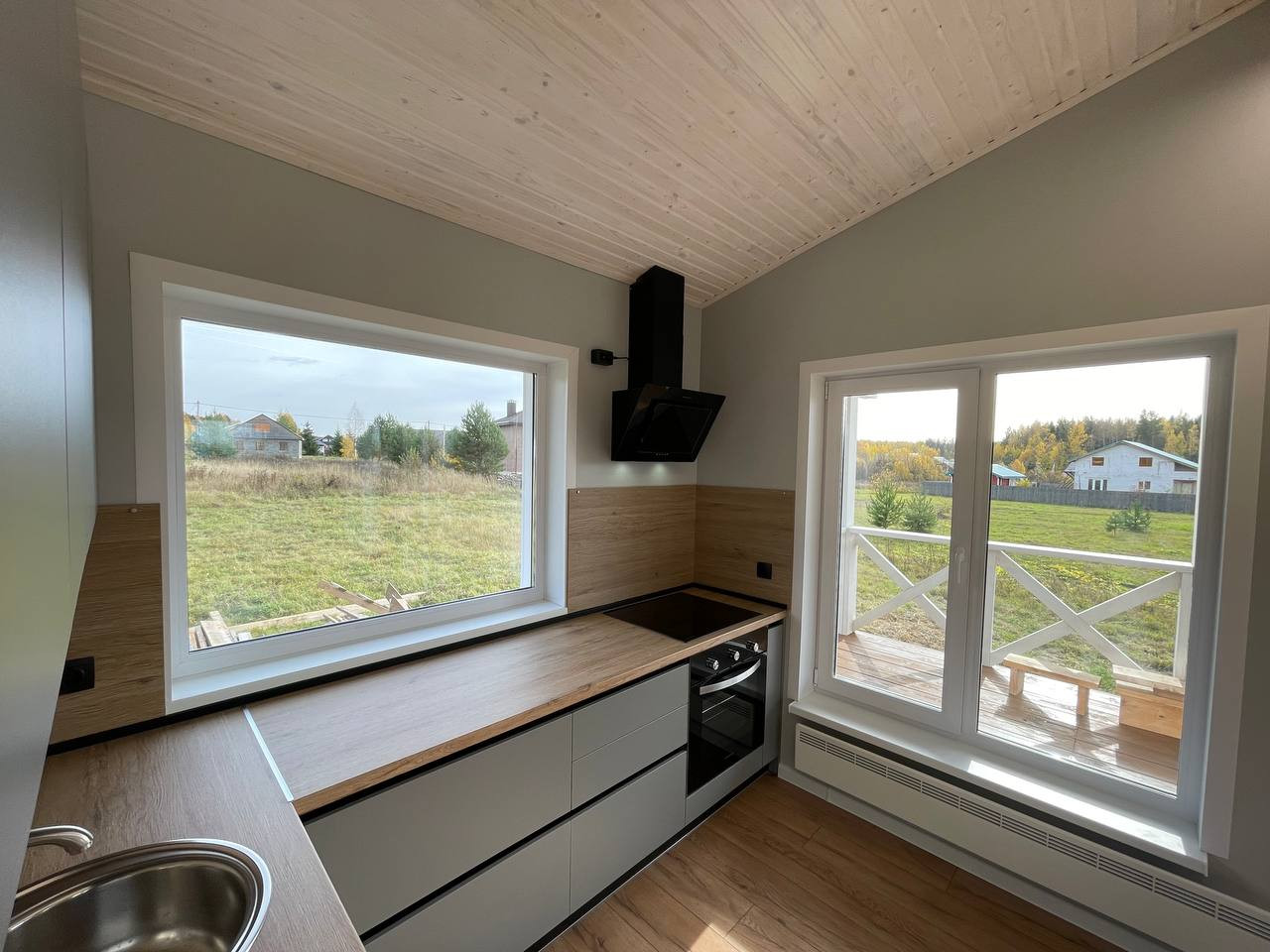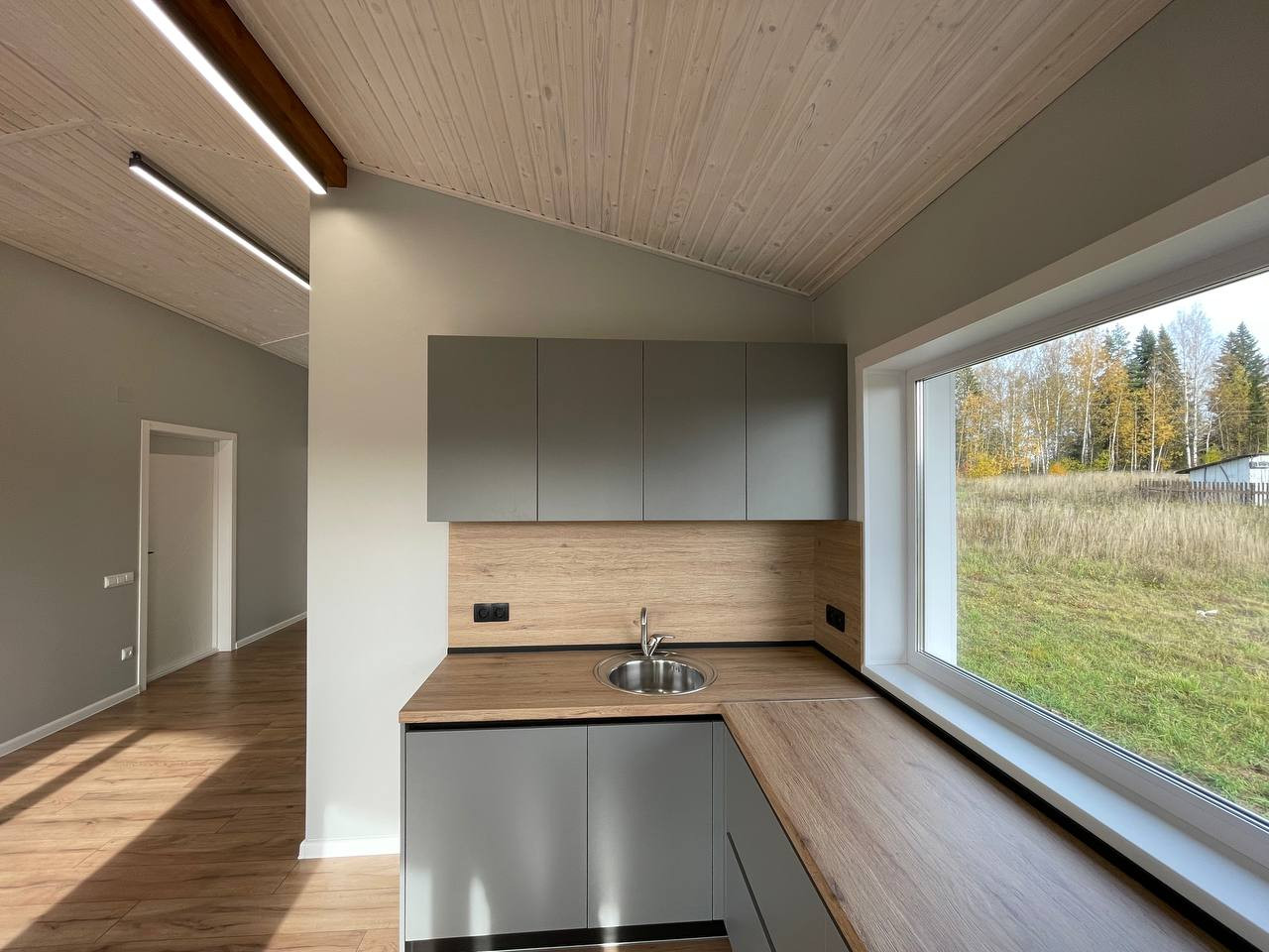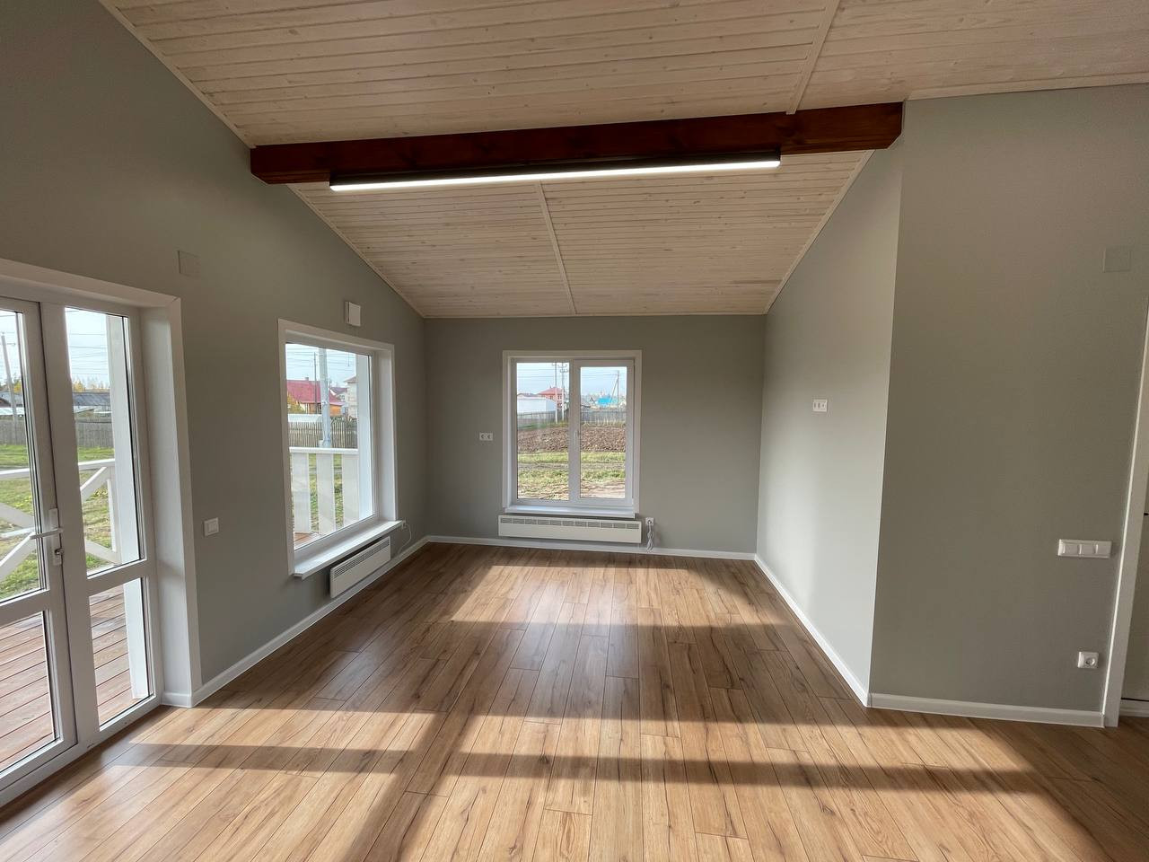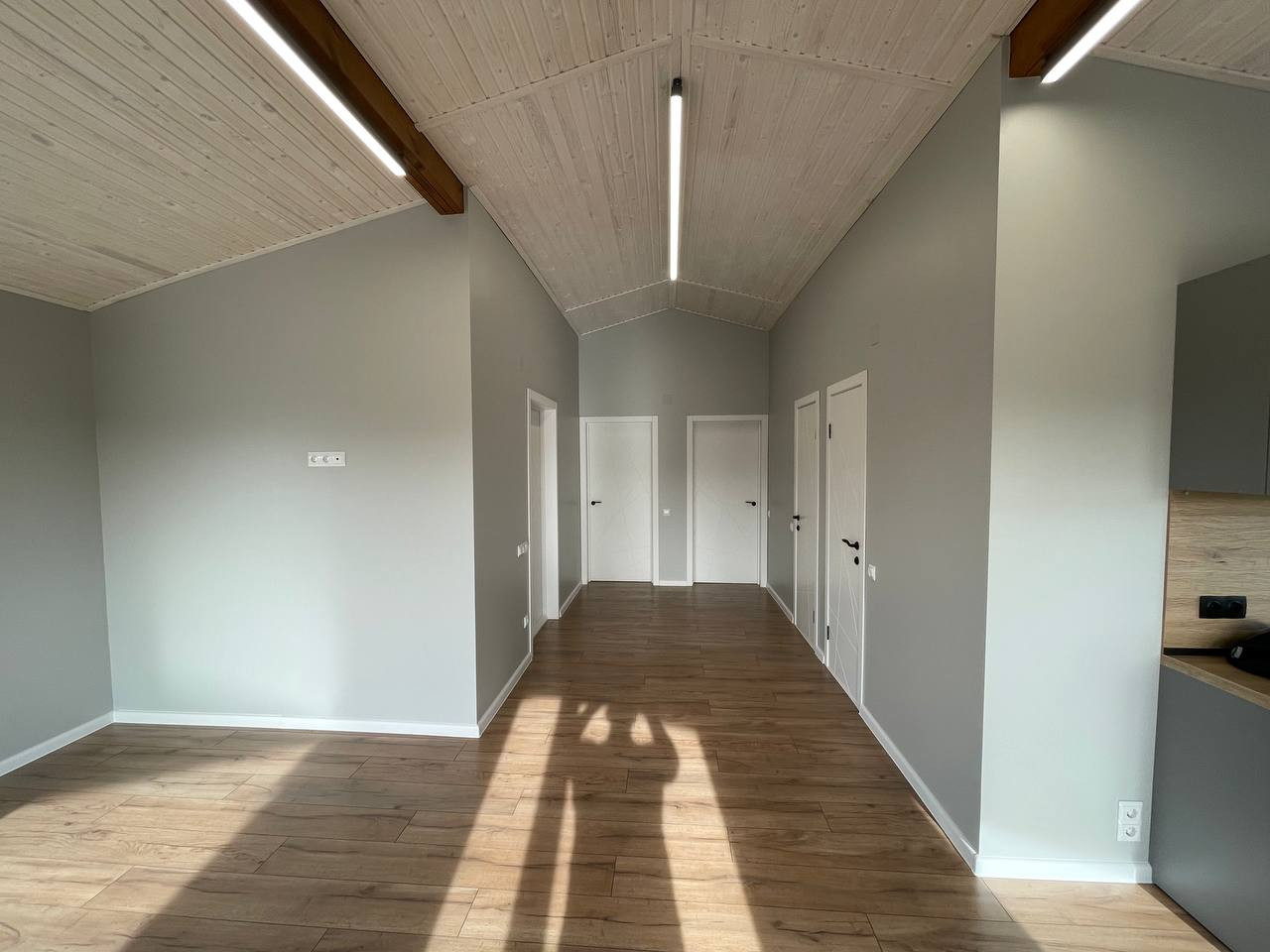 Открытая кровля по всему дому. Высота потолков 3,9 метра в коньке