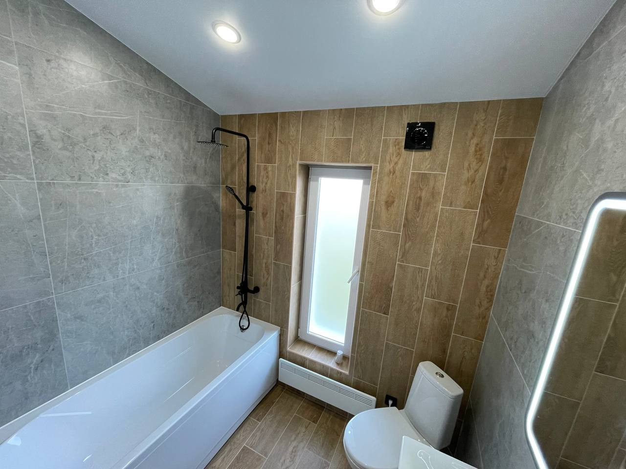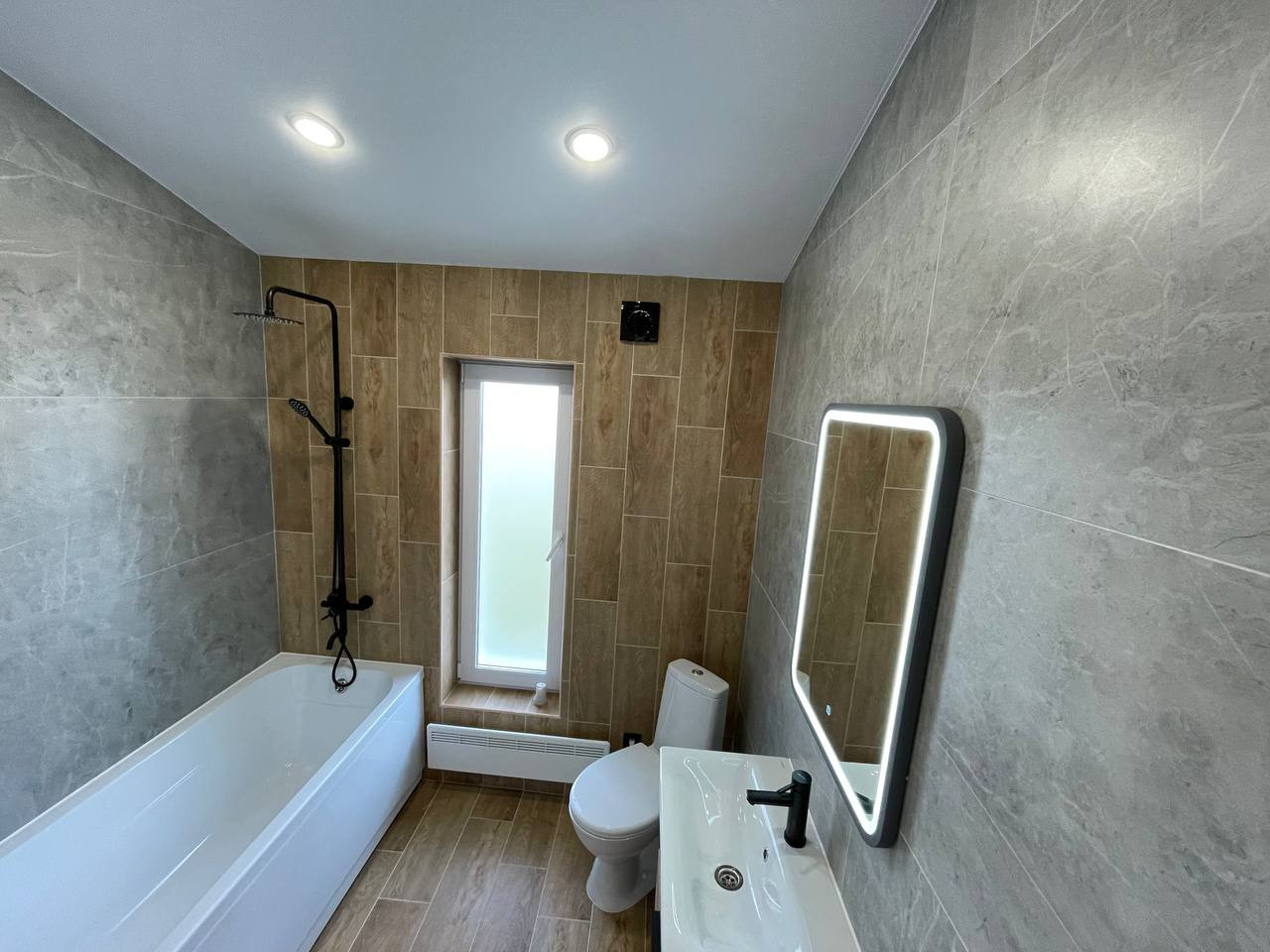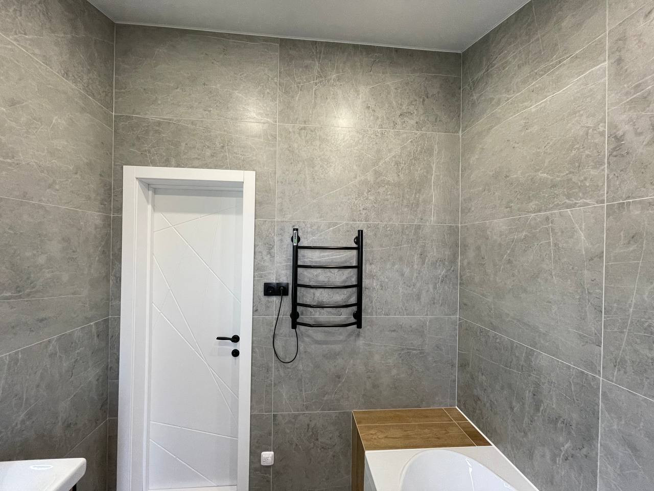 Стены в ванне керамогранит крупноформатный 1200х600.