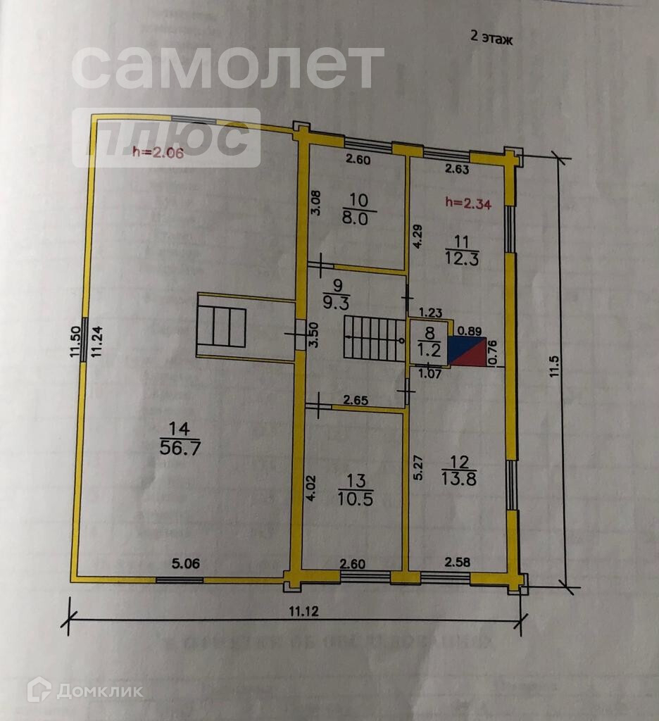 2 этаж состоит из четырех комнат: 8м, 12,3м, 13,8м и 10,5м, коридор 9,3м, веранда 56,7м (теплая комната, не достроена)