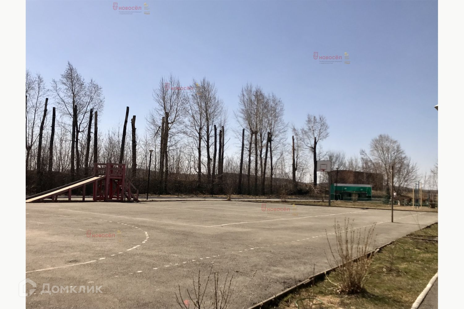 Во дворе современная детская площадка, спортивная площадка, выход на берег пруда.