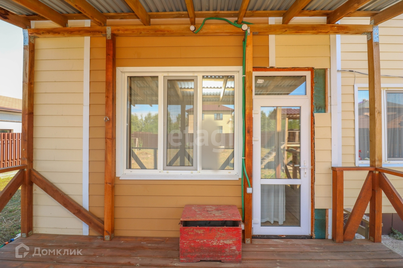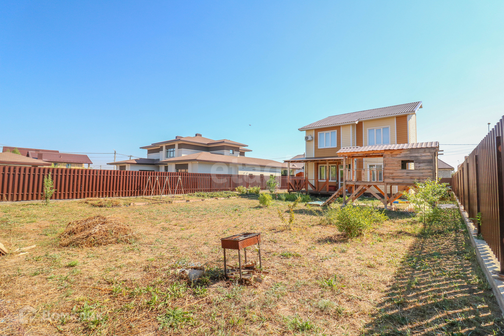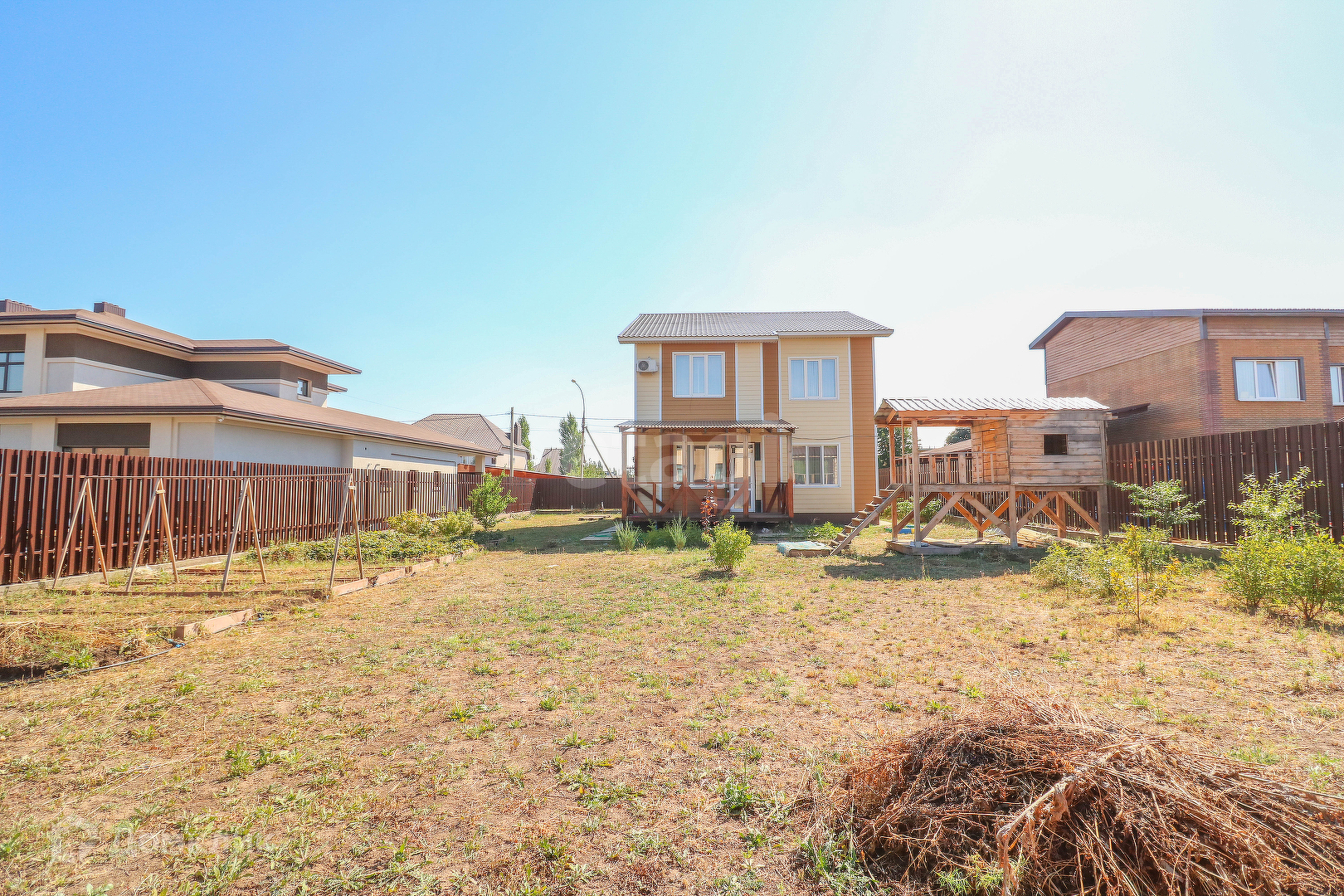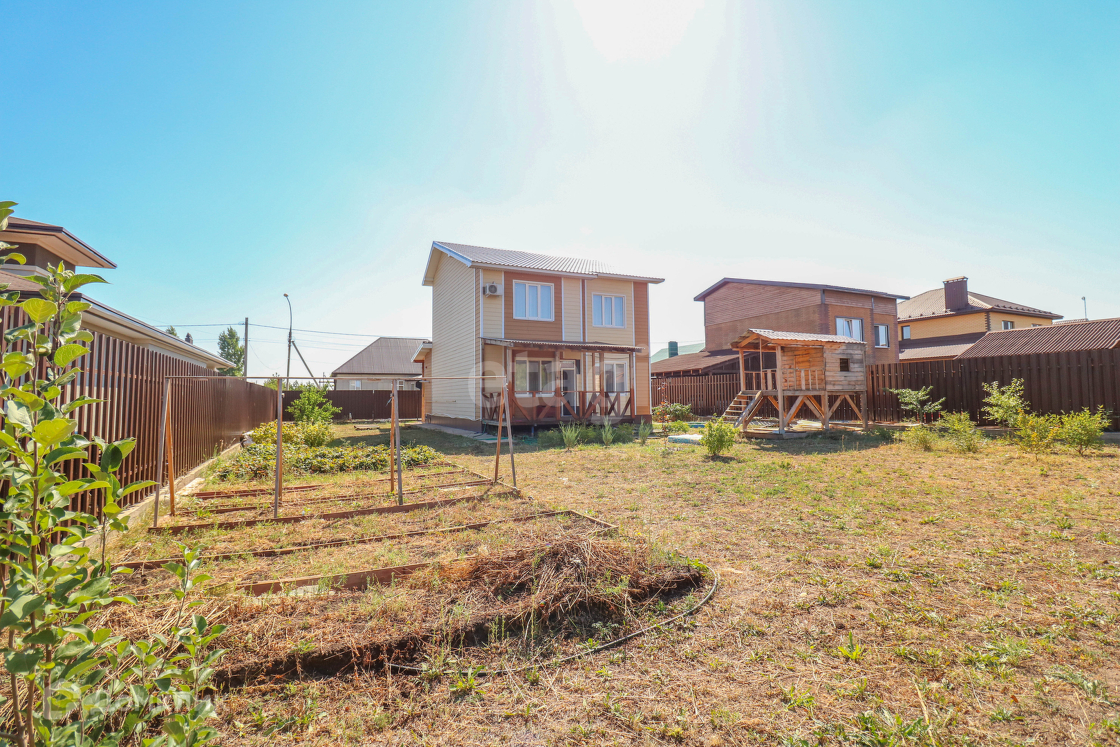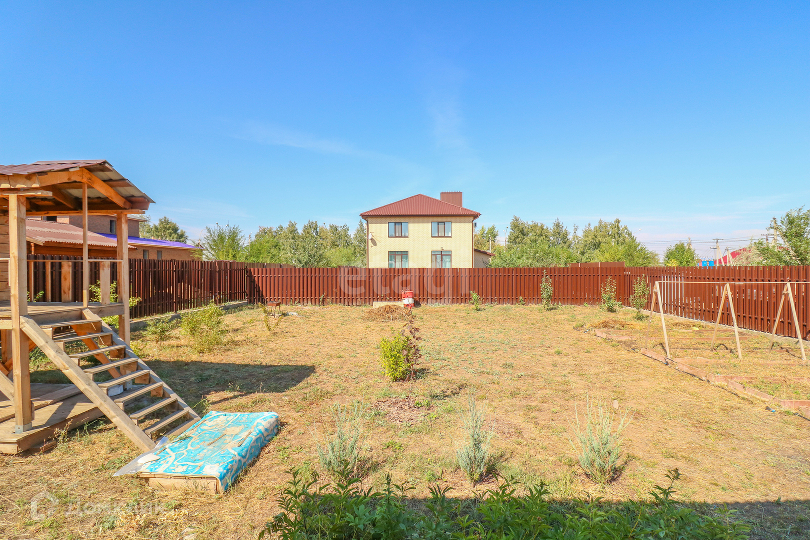 На участке оборудован деревянный детский домик. По периметру посажены деревья.