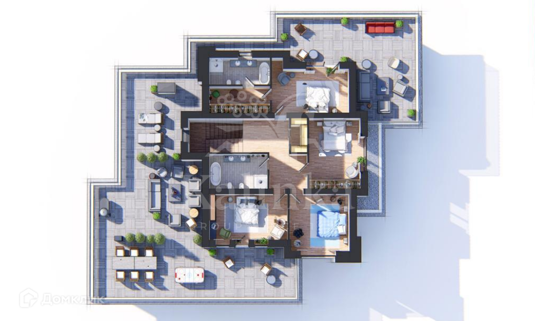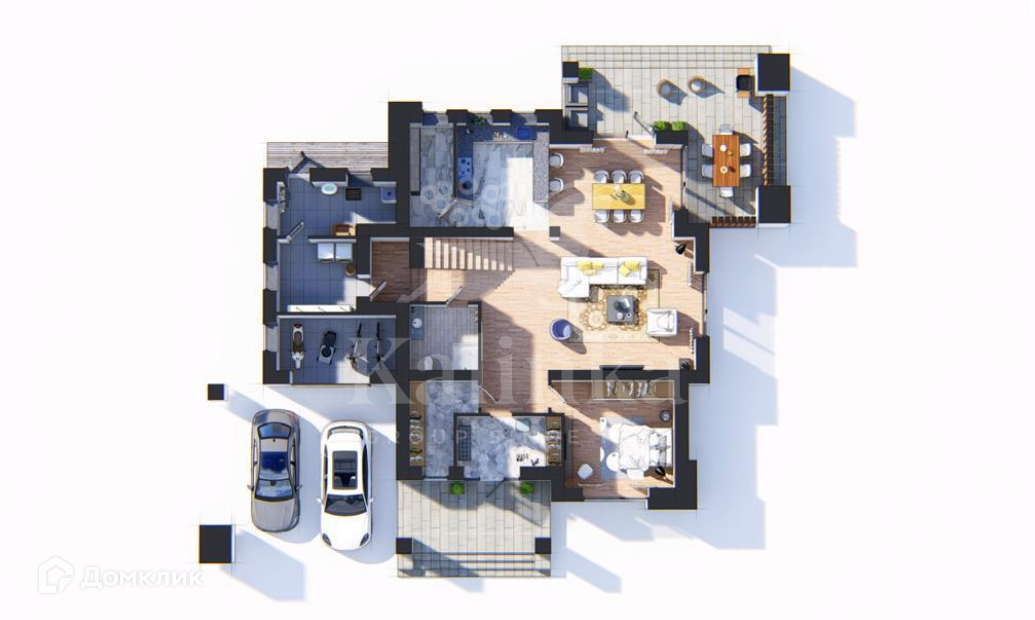 2 этаж: холл, мастер-спальня с гардеробной, с/у и выходом на террасу; 2 спальни, спальня с выходом на террасу, ванная комната.