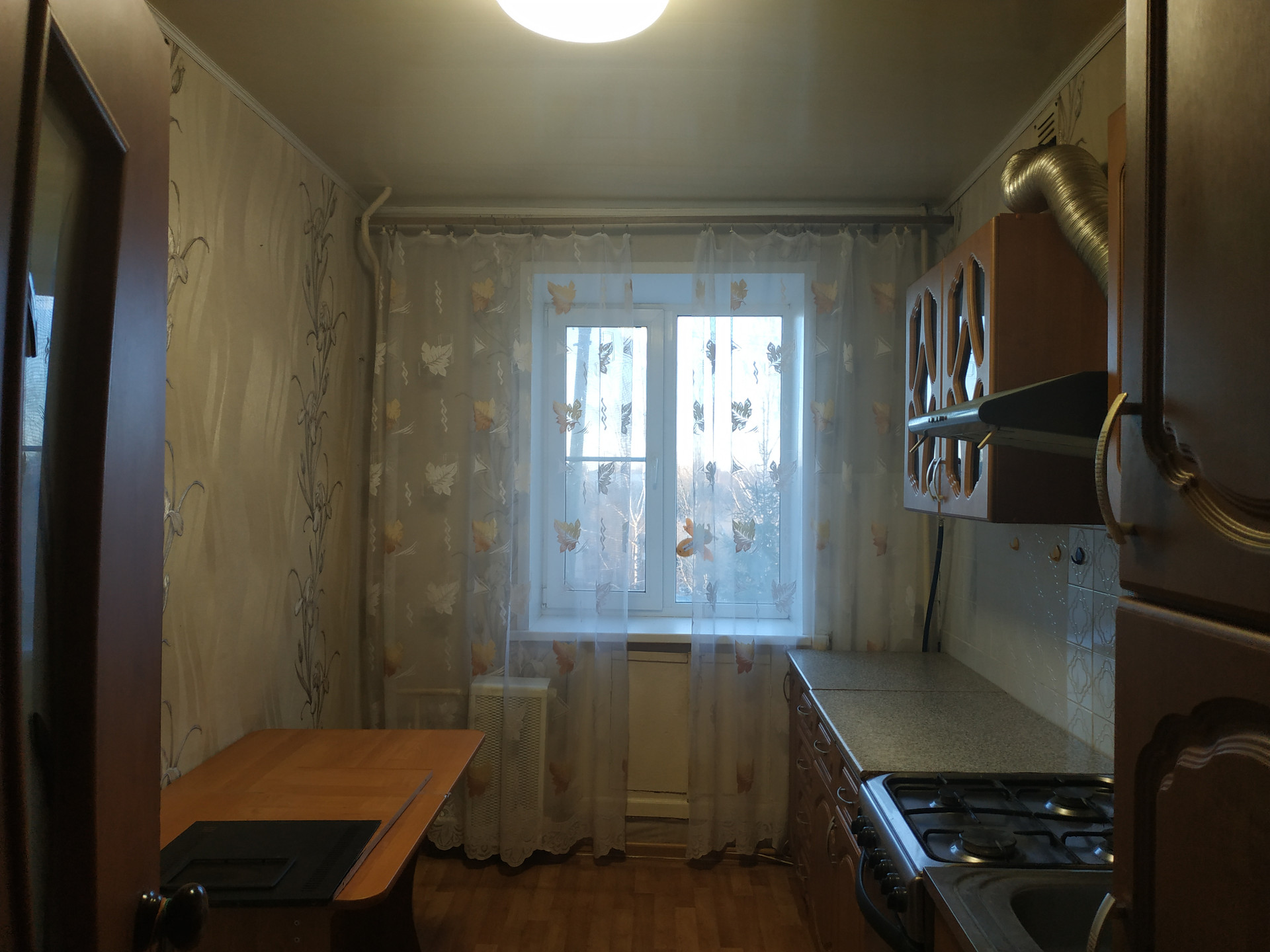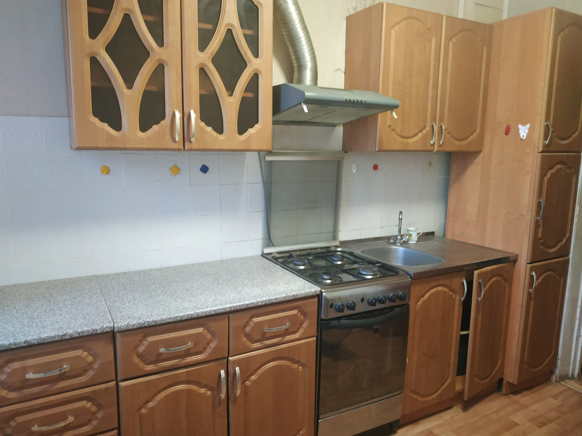 - кухонный гарнитур, вытяжка, холодильник, газовая плита,