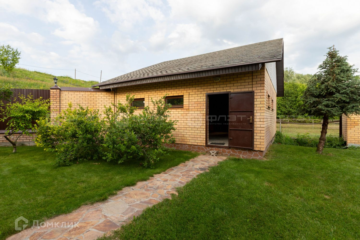 Имеется вольер для собак. Вся территория продумана , облагорожена, высажены деревья и кустарники для красивого вида .
