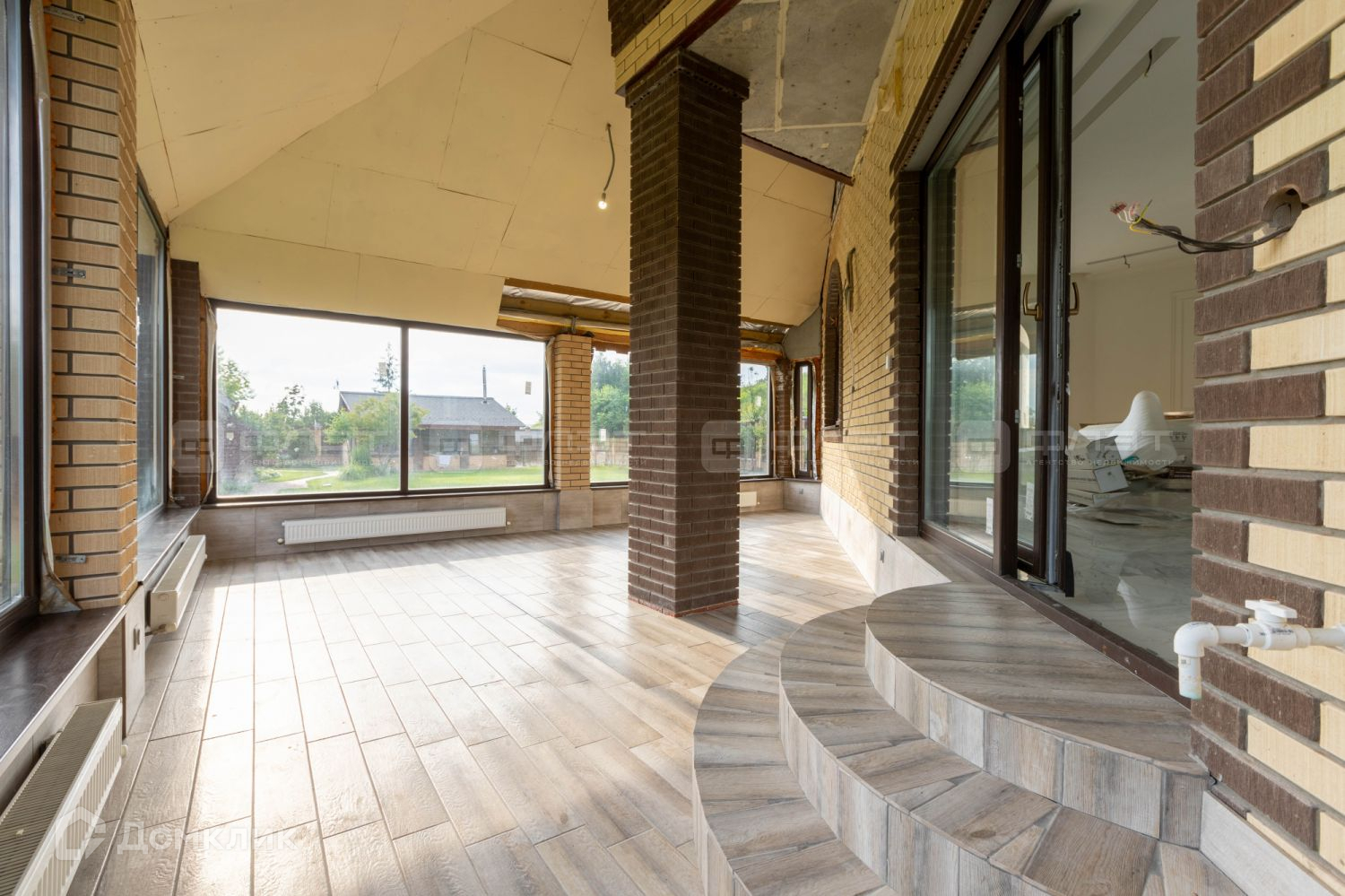 Основной дом имеет первый ,второй и цокольный этажи, на первом этаже есть зимний сад, установлена кухня, стены подготовлены под покраску.