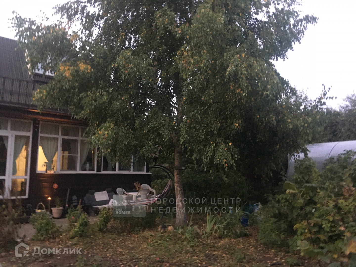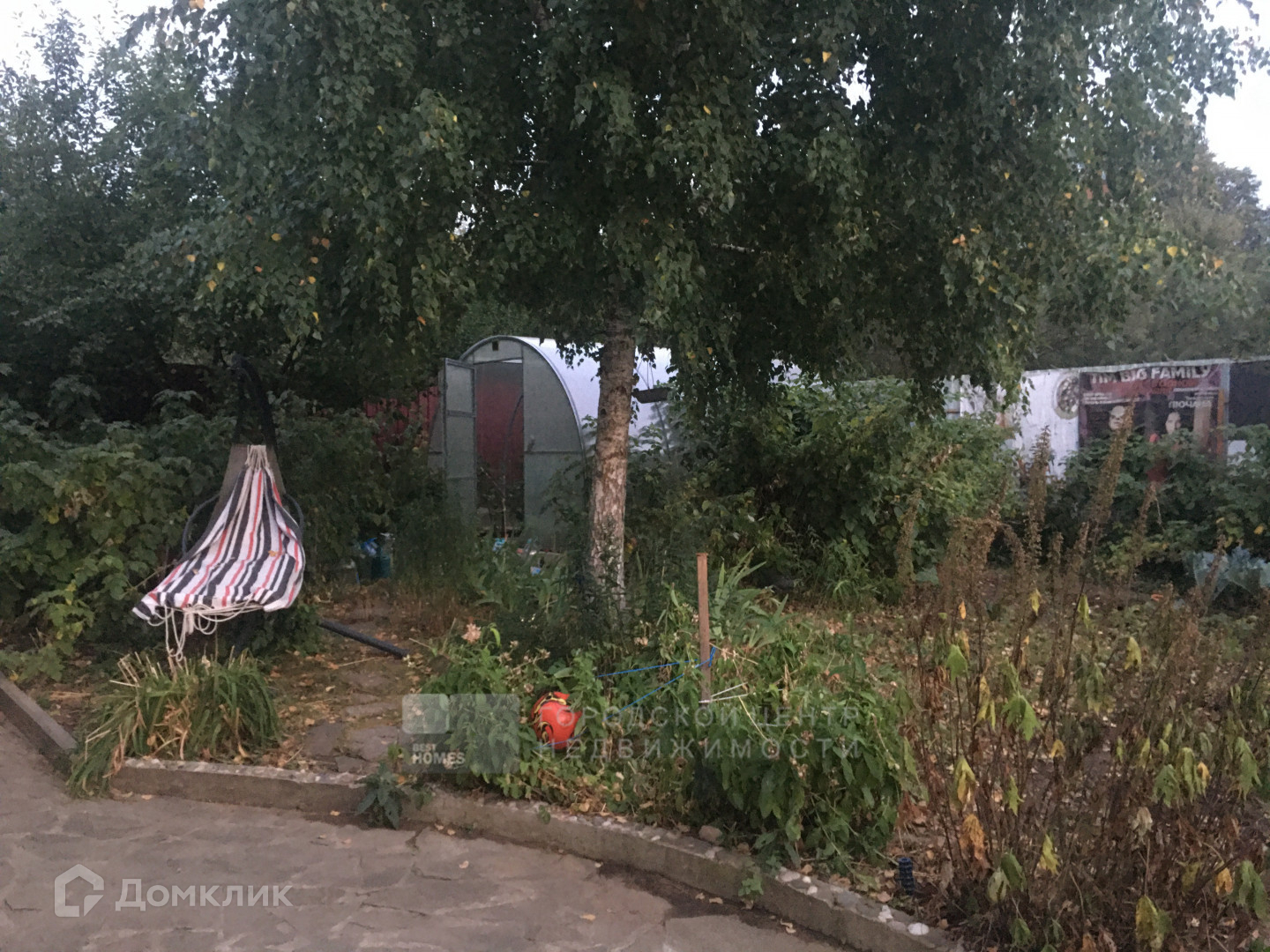 На уютном участке в 5 соток есть огород, теплица, парковочная зона. Участок утопает в зелени. Есть высокие лесные и плодовые деревья.
