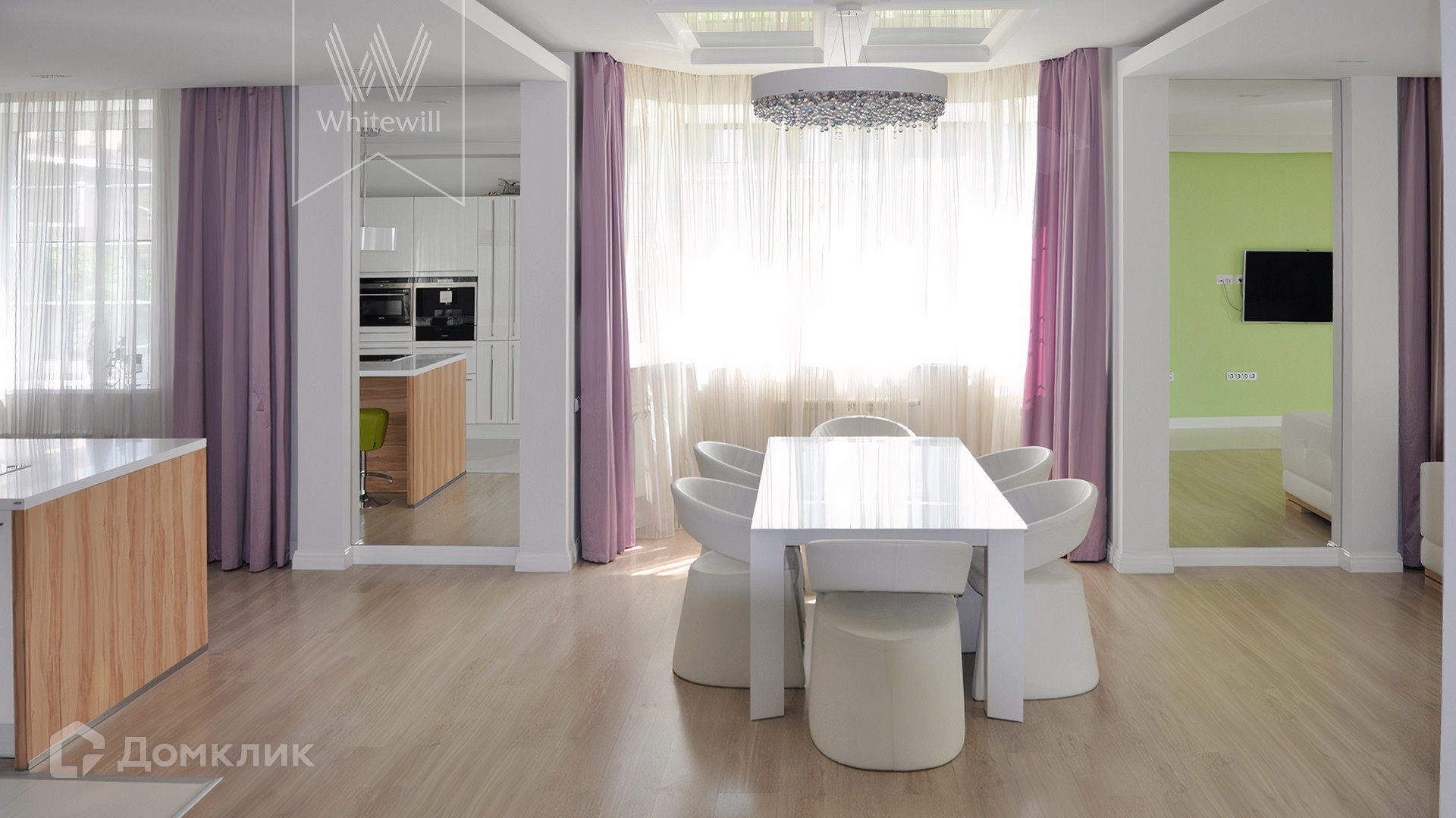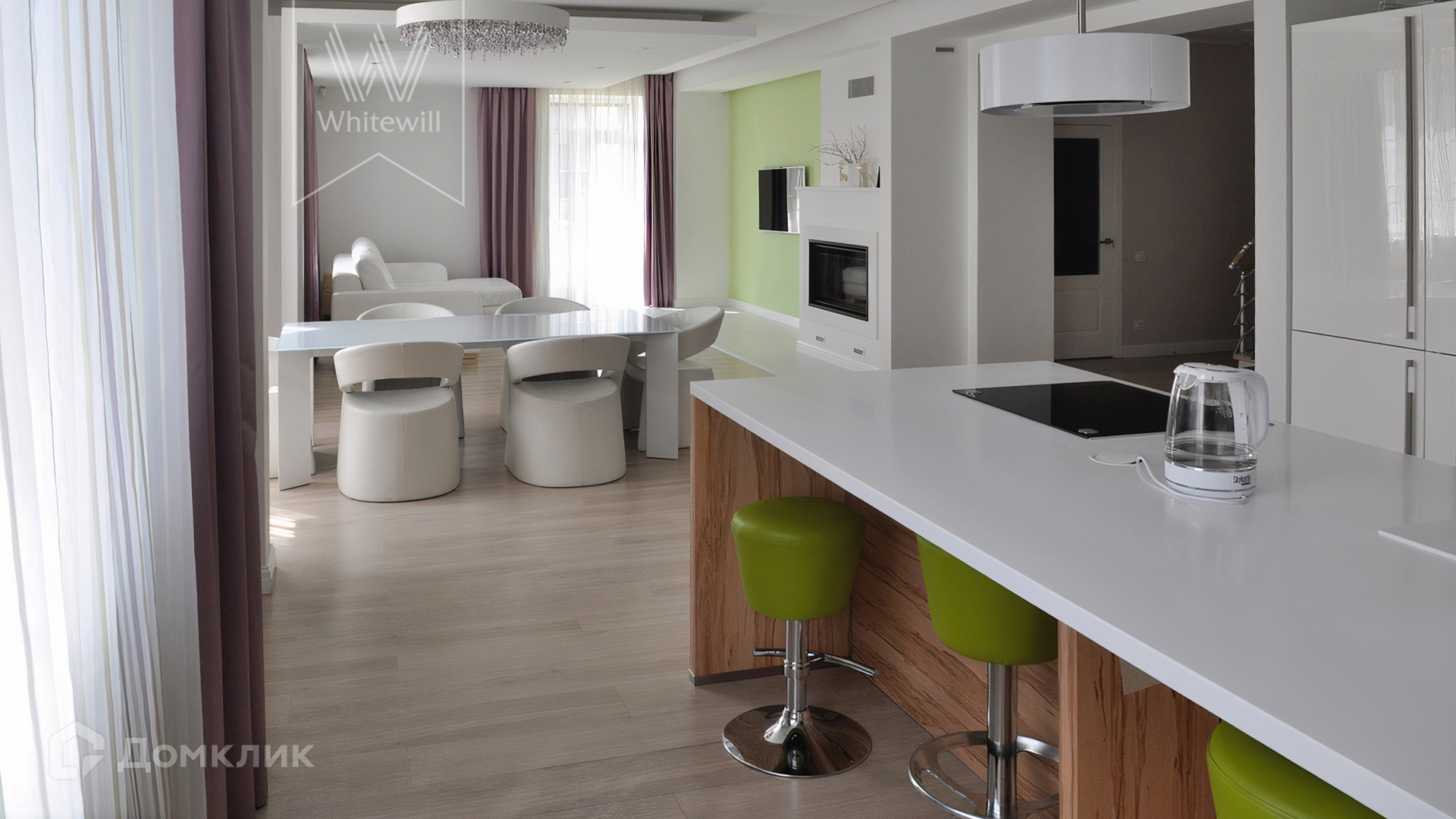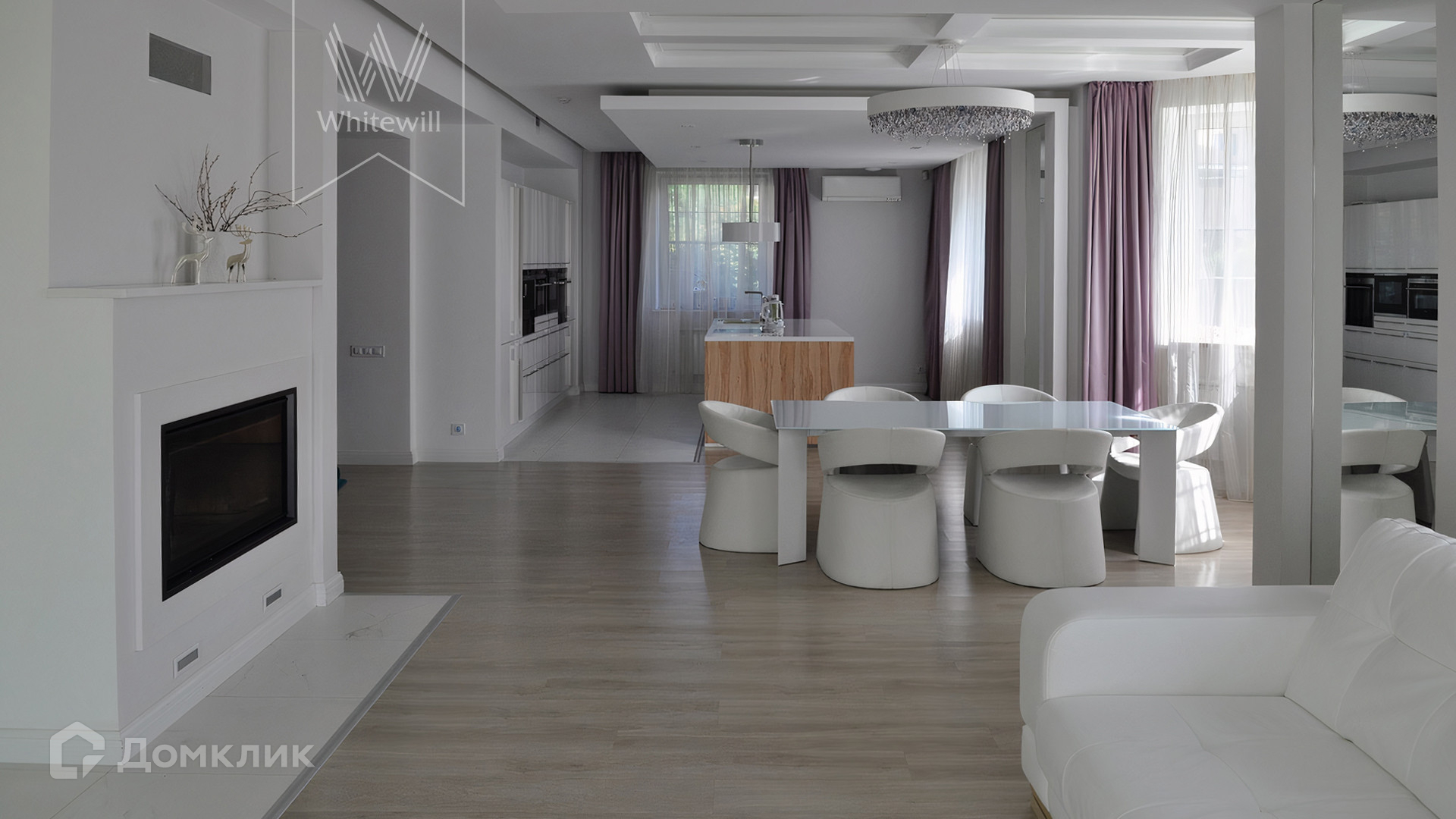 ID 12 221. Западная Резиденция. Загородный дом площадью 447 м² построен на участке 12,1 сотки. Интерьер в современном стиле оформлен в светлых оттенках, визуально создающих ощущение простора. В резиденции разместили 4 спальни, гостиную с камином, переходящую в столовую и кухню, кабинет, комнату отдыха, домашний кинотеатр и бильярдную. На цокольном этаже расположена SPA-зона с бассейном и сауной. В контуре дома предусмотрен гараж.