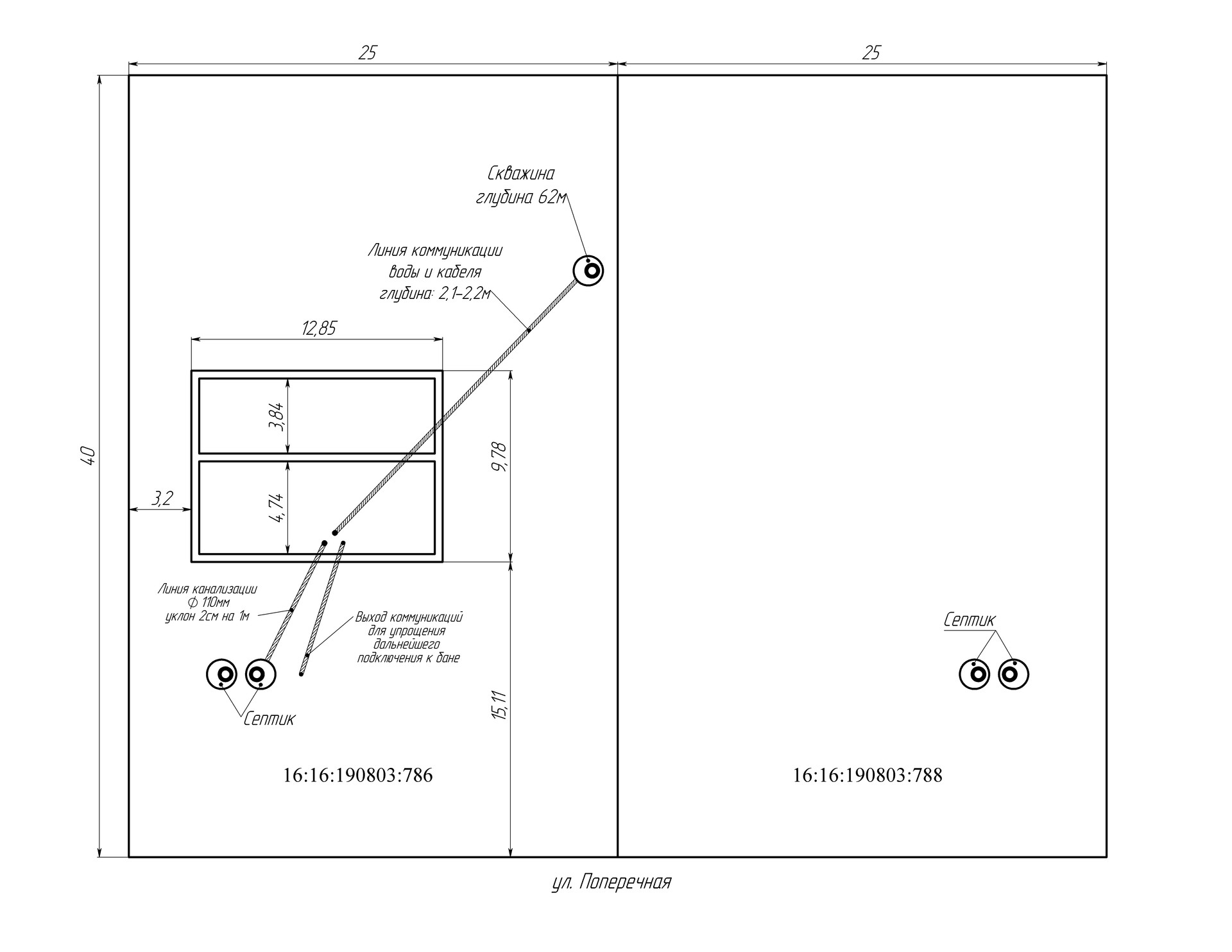 Также установлены под ключ септики с переливом, на каждом участке, два ряда по три кольца (d1,5*h2,7м, 8куб.м), линия канализации тоже проведена.
