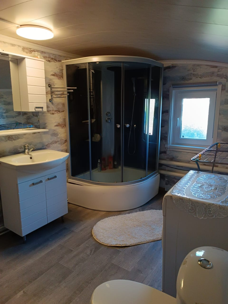 В доме заведены все коммуникации. Интернет оптоволокно, газ, вода, центральная канализация. Санузел в доме, установлена душевая кабина. Косметический ремонт. Остаётся встроенный шкаф, новый кухонный гарнитур.