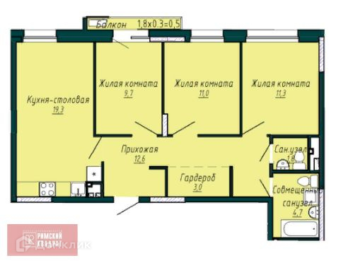 В квартире просторная кухня-гостиная а 18,1 м.кв. и три спальни по 11 м.кв.