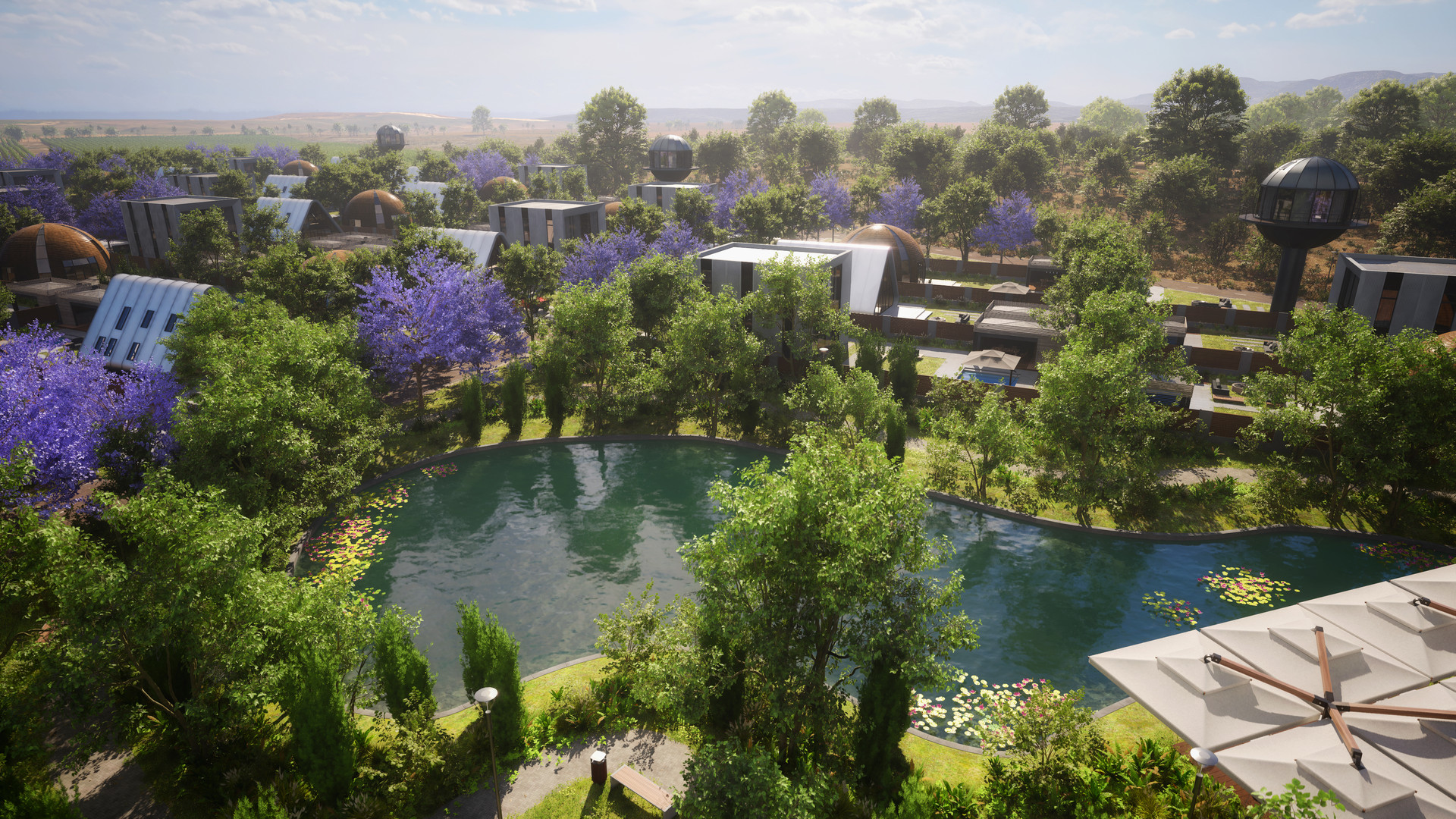 Каждый дом расположен на собственном участке от 6 соток. На участке: парковка на 2 авто, бассейн, летняя кухня с барбекю, костровая, 2 сценария архитектурной подсветки
