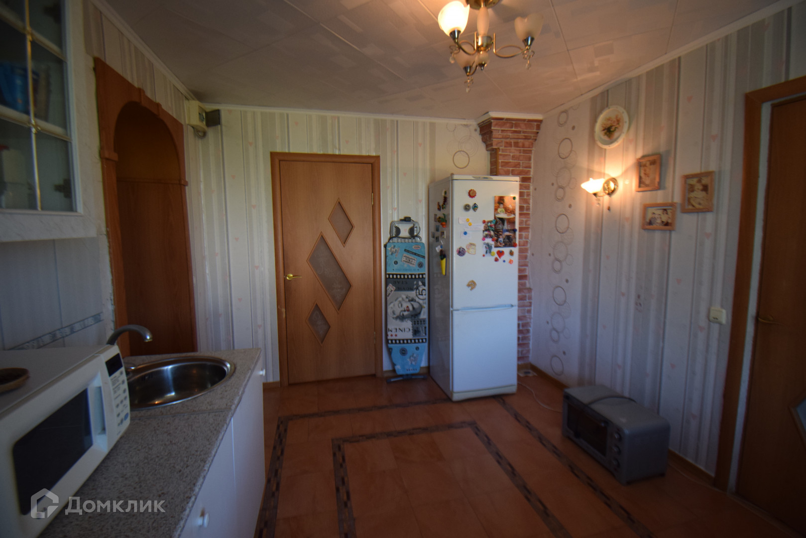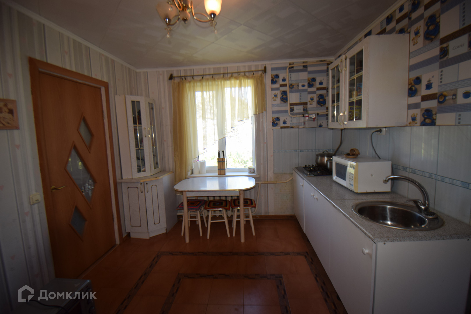 В кухне на полу уложена кафельная плитка ,а по всему дому постелен ламинат .