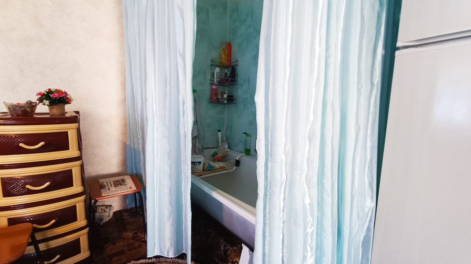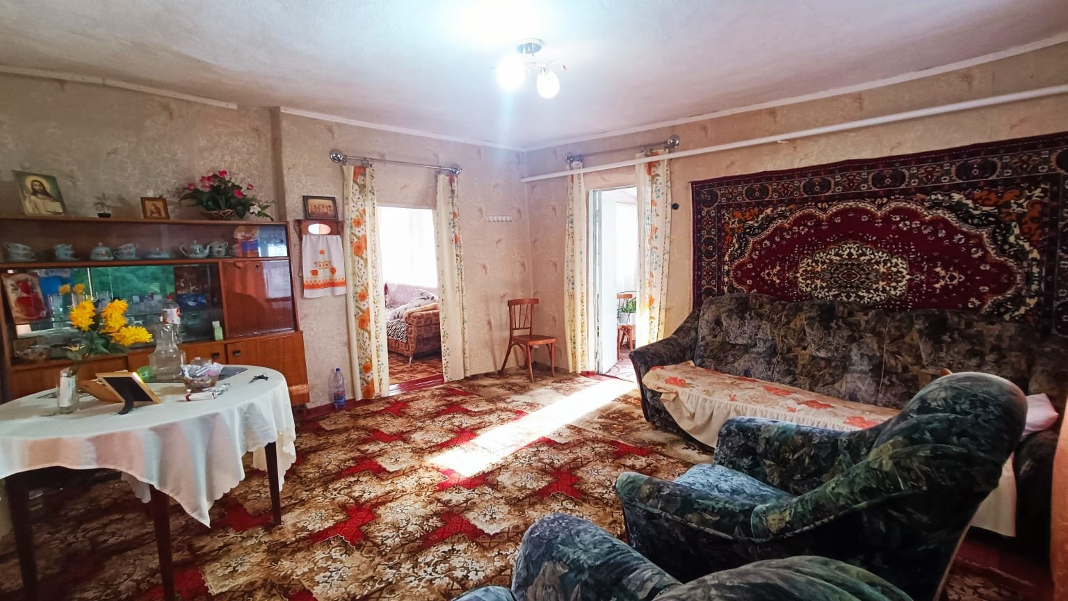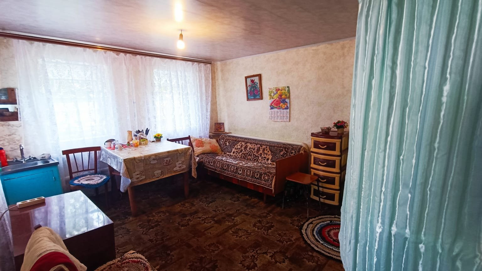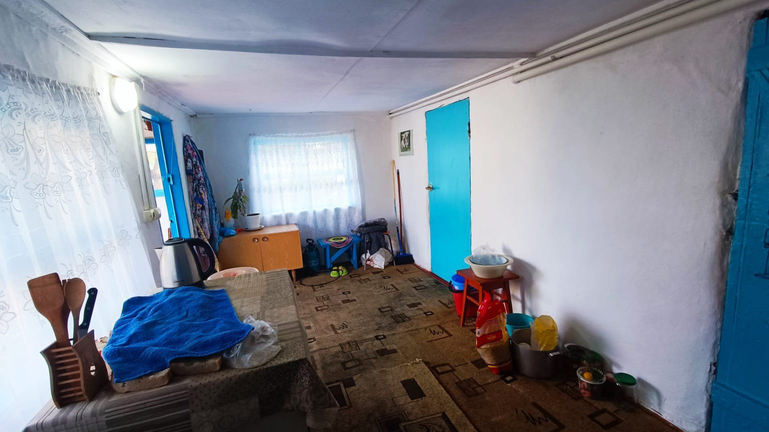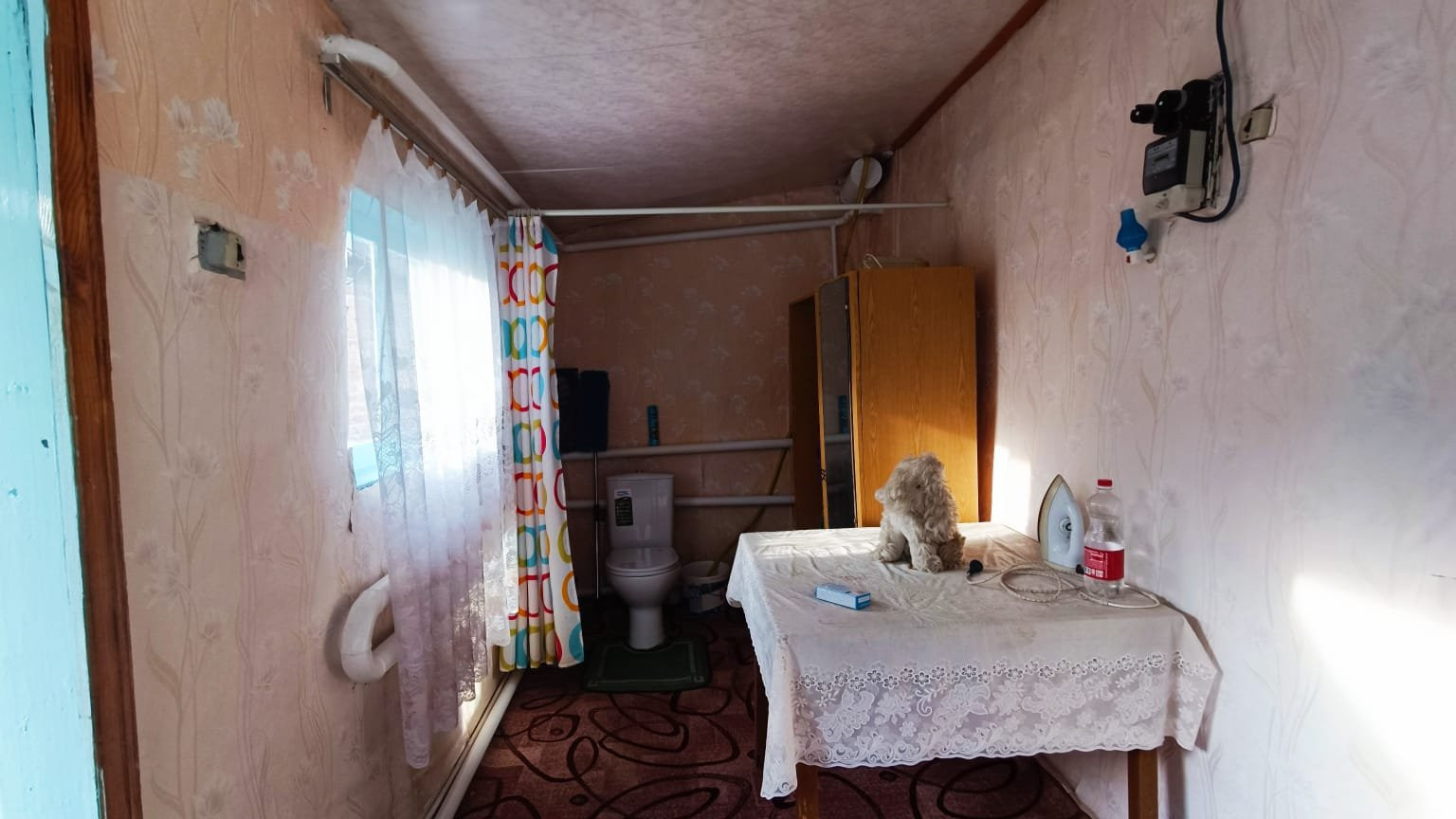 Саманное домовладение, кровля - металлопрофиль, о.п. 44 кв.м., расположенное в с. Первомайское по ул.Набережная. Состоит из двух комнат смежного расположения и коридоров. В комнатах стены и потолки оклеены обоями, полы - дощатые. В коридорах на стенах обои, потолки обшиты пластиковыми панелями, полы дощатые. Один из коридоров объединен с с/у (унитаз). Установлены счетчики на коммуникации. Входная дверь - металлическая.