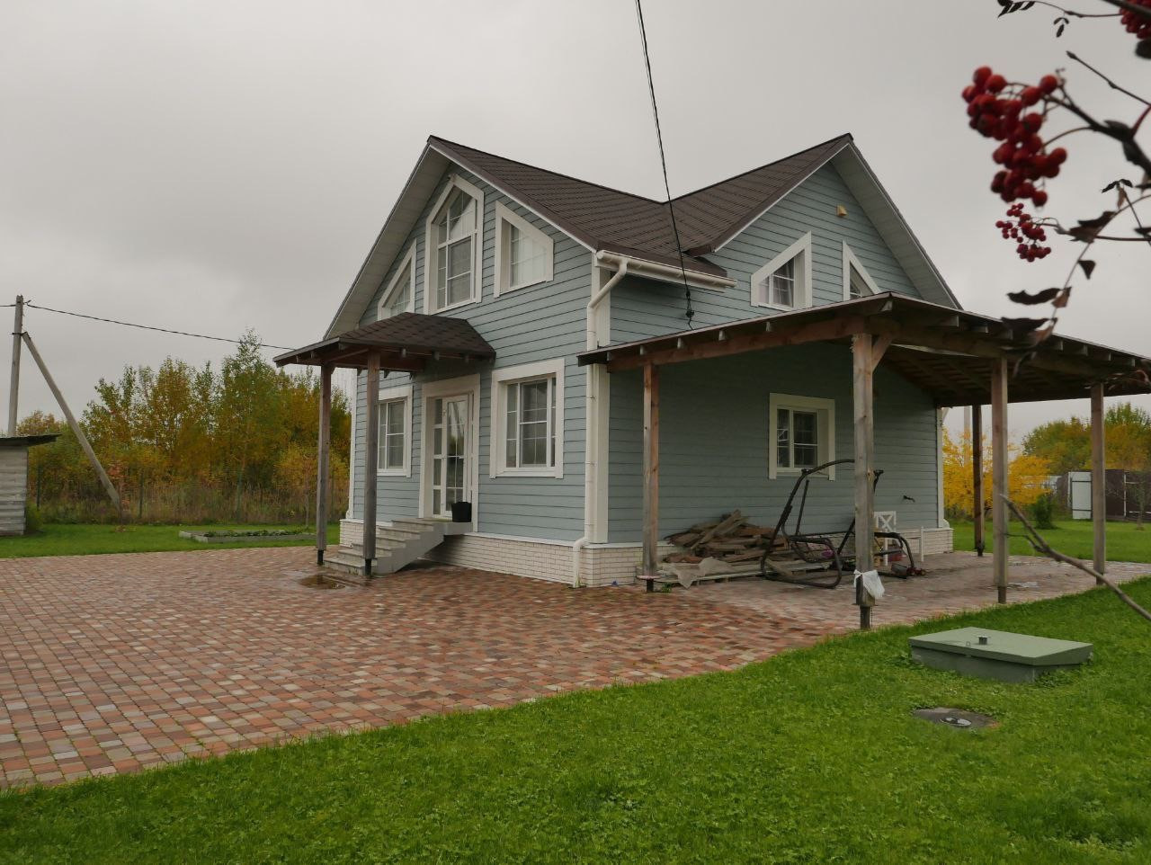 Отмостка вокруг дома, парковка под навесом и площадка перед домом выложены брусчаткой (площадь более 200 м2).
