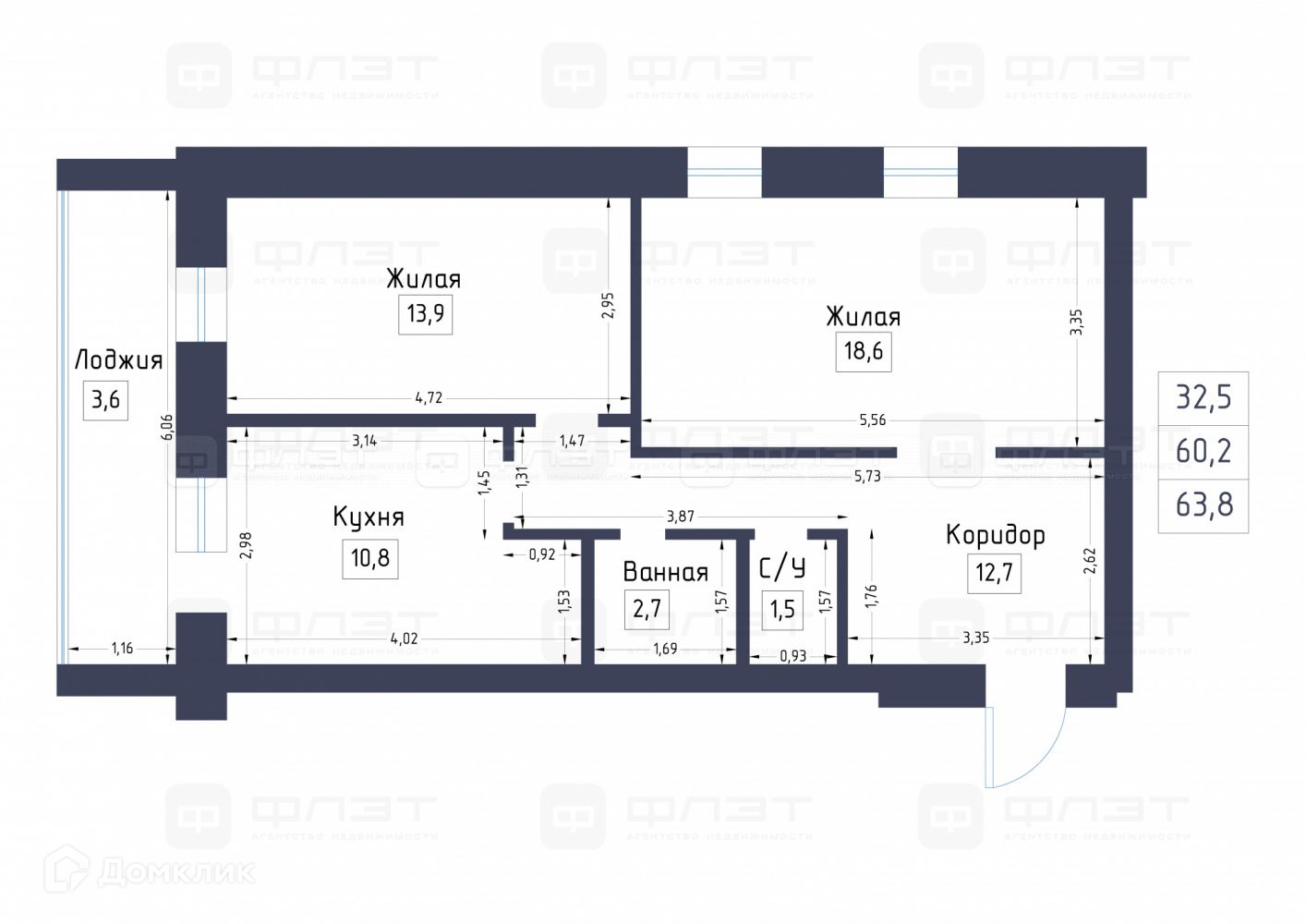 Общая площадь 63.8 м2