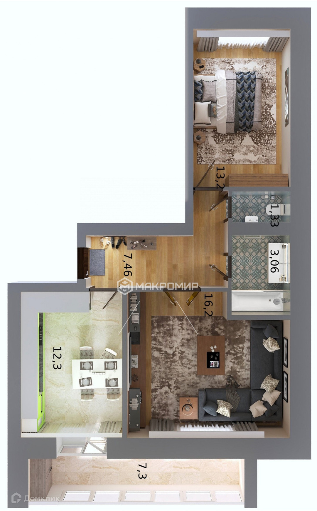 · Просторная кухня-столовая 12,3 кв.м., с выходом большую лоджию 7,3 кв.м.!