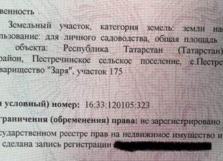 с.Пестрецы . Продаю участок 8 соток с/т"Заря ".Место тихое,чистый воздух. Рядом озеро, рыбалка. На участке электричество, вода сезонная. Дачный участок расположен недалеко от самих Пестрецов можно строится и регистрироватся для постоянного проживания. Кадастровый номер участка 16:33:120105:21