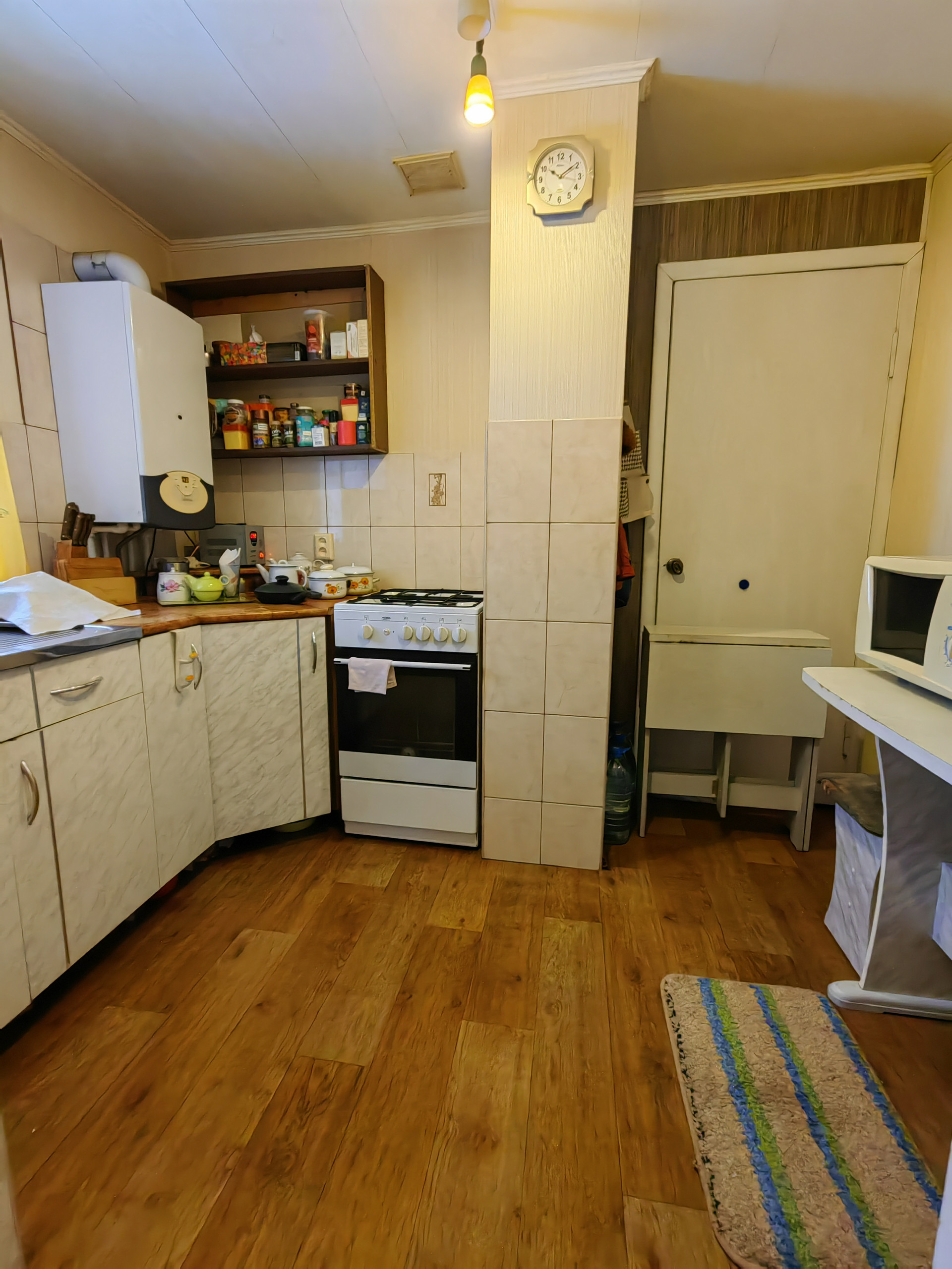 На кухне остается кухонный гарнитур, газовая плита, обеденный уголок.