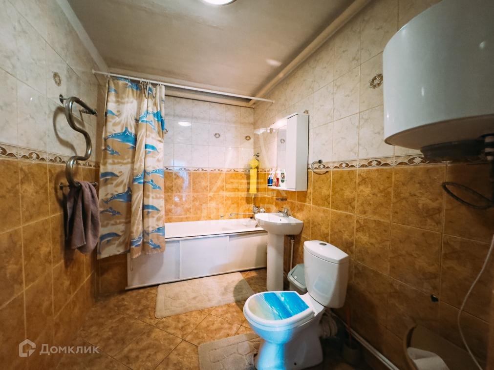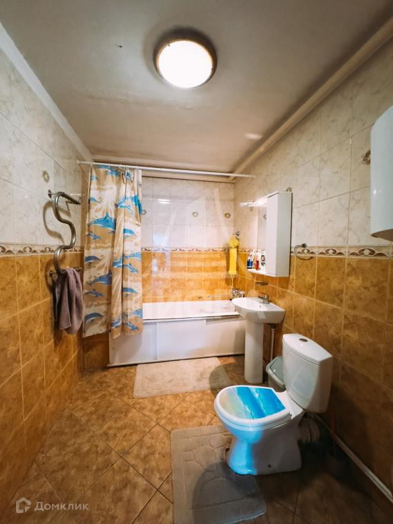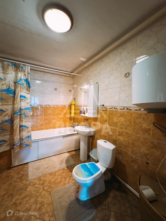 Санузел совмещенный, облицован плиткой. В санузле установлена ванна, унитаз, раковина, в наличии вместительный бойлер для нагрева воды.