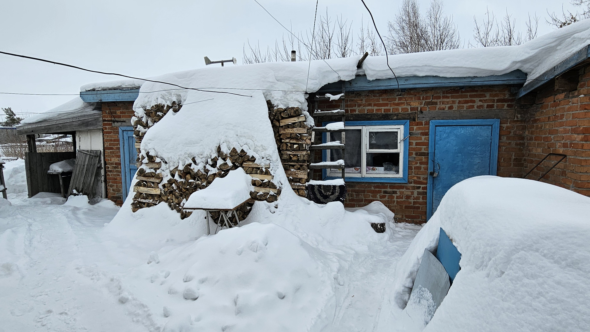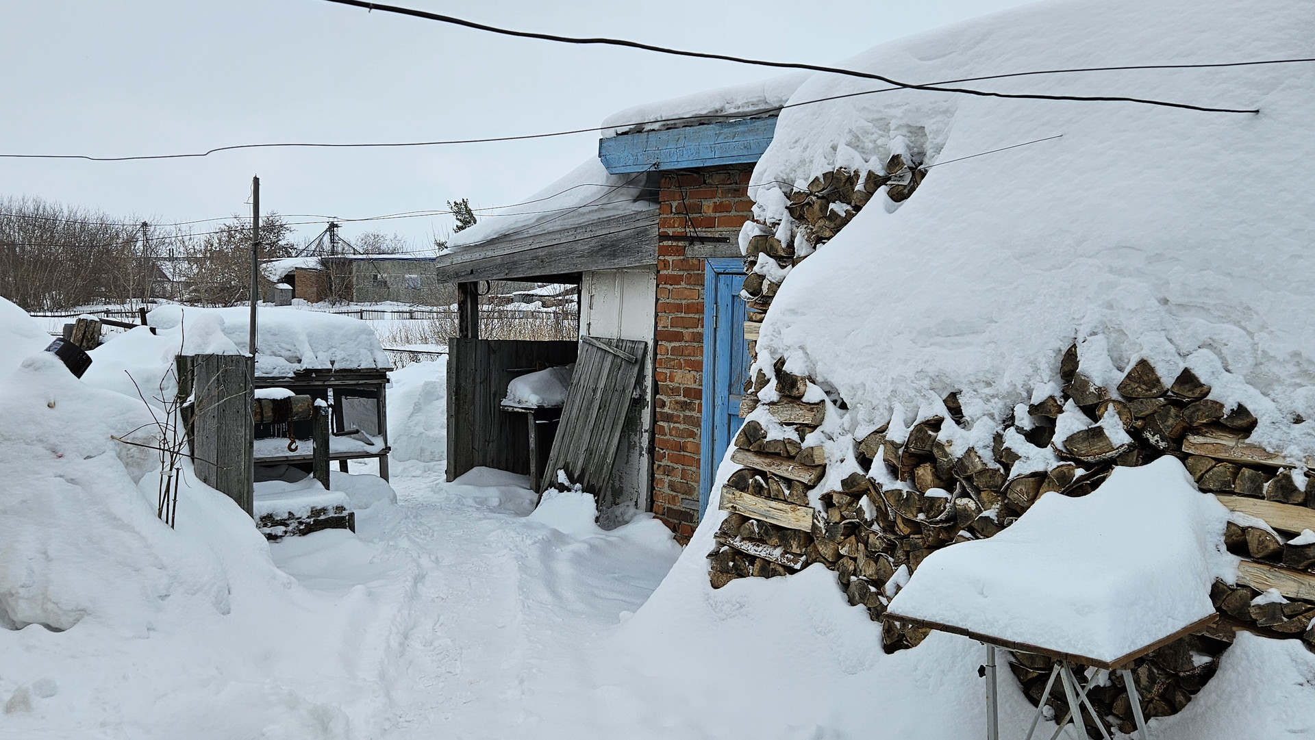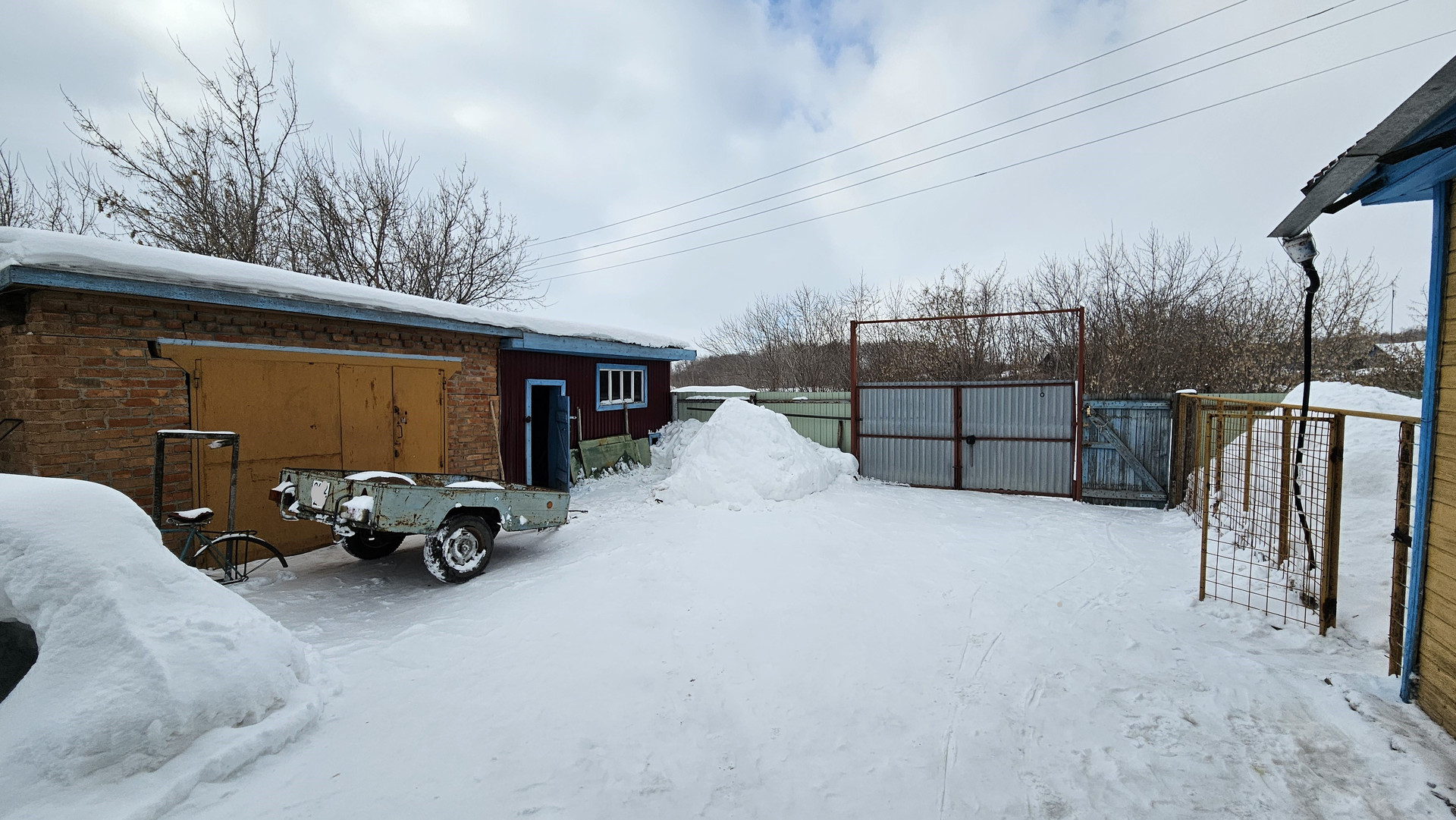 Под одной крышей кирпичные постройки: гараж, баня, дровенник, летняя кухня.