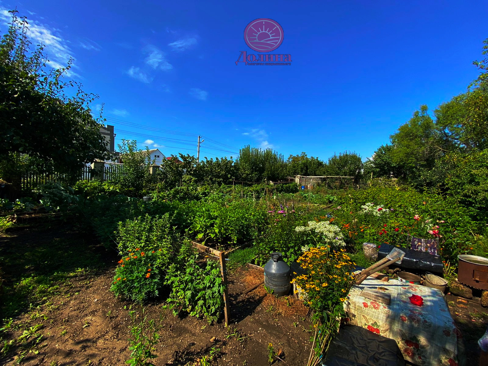 Участок полностью огорожен. Также на нем посажены фруктовые деревья и кустарники.