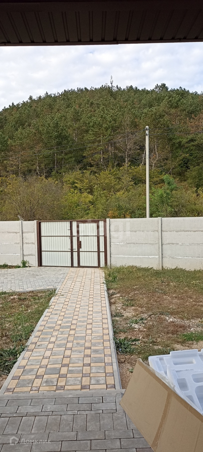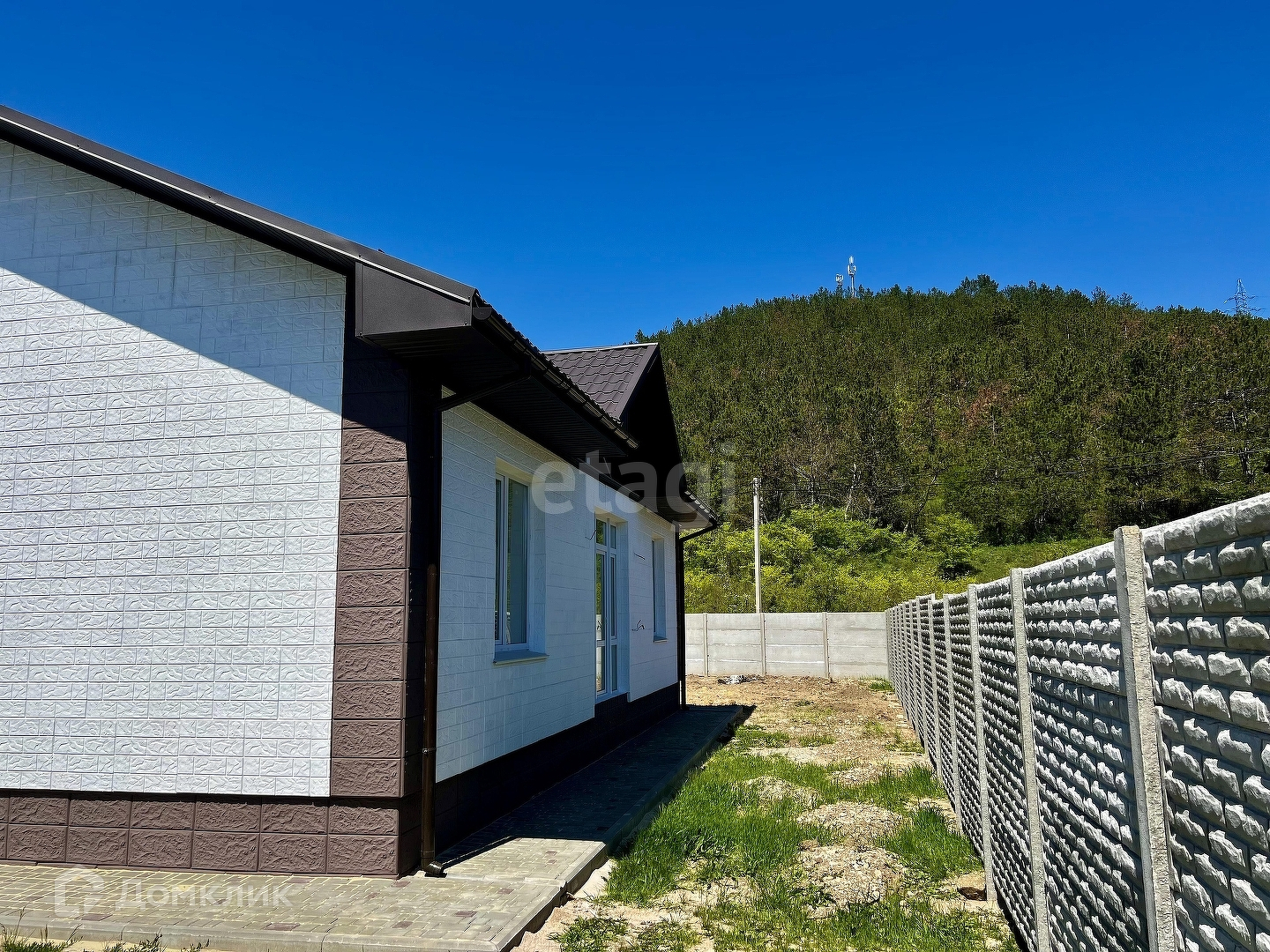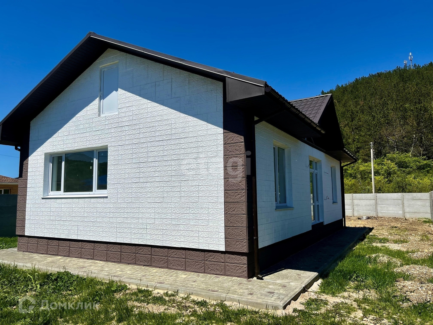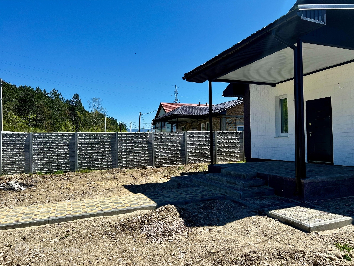Дом огорожен бетонным забором (еврозабор), во дворе тротуарная плитка. До города 5 км или 5 мин на авто.