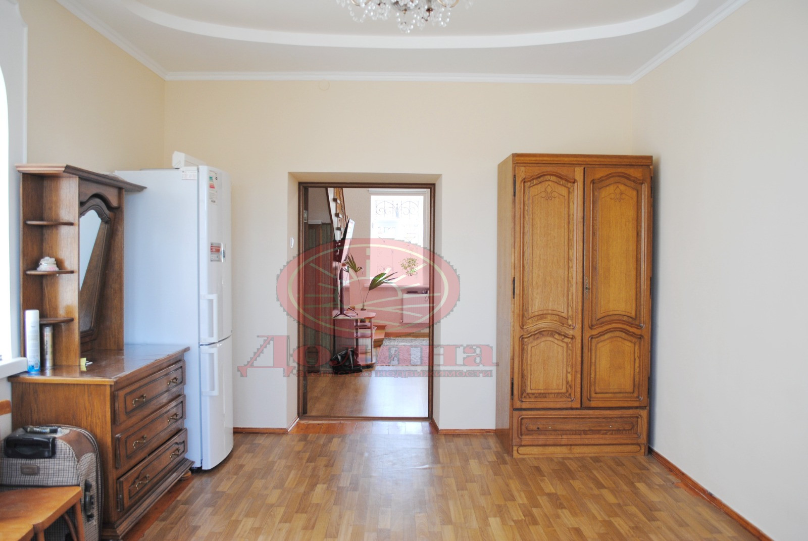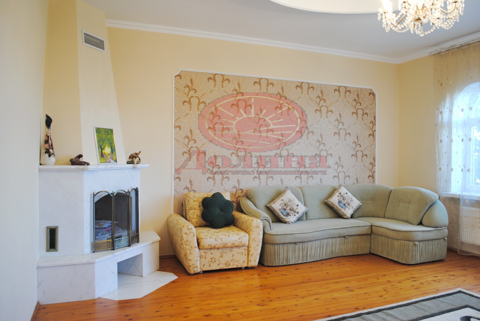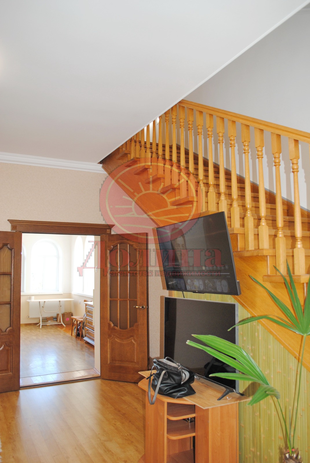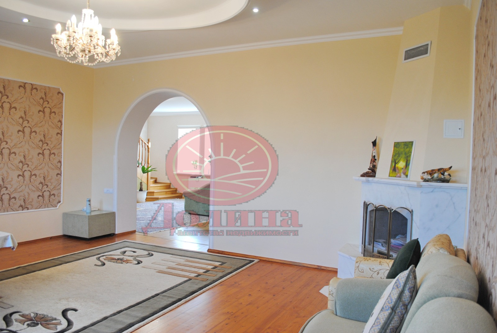 На 1-м этаже располагается : большой холл, кухня с выходом в подвал, огромный зал с действующим мраморным камином, боьшая комната,которая использовалась как столовая, сан.узел, лестничный маршм на второй этаж. Лестница очень качественно сделана, она широкая и крепкая, выполнена из дуба.